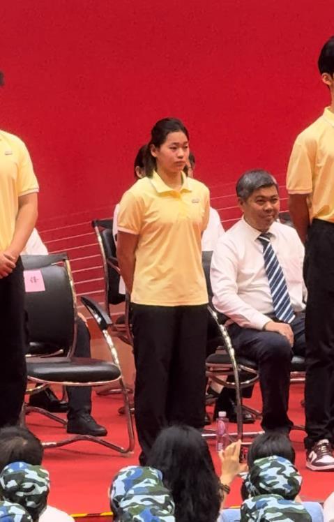 视频显示,全红婵坐在第一排,她起身热情地和同学们打招呼,后又作为学生代表走上台,校领导为她颁发徽章,随后全红婵将其佩戴在胸前。