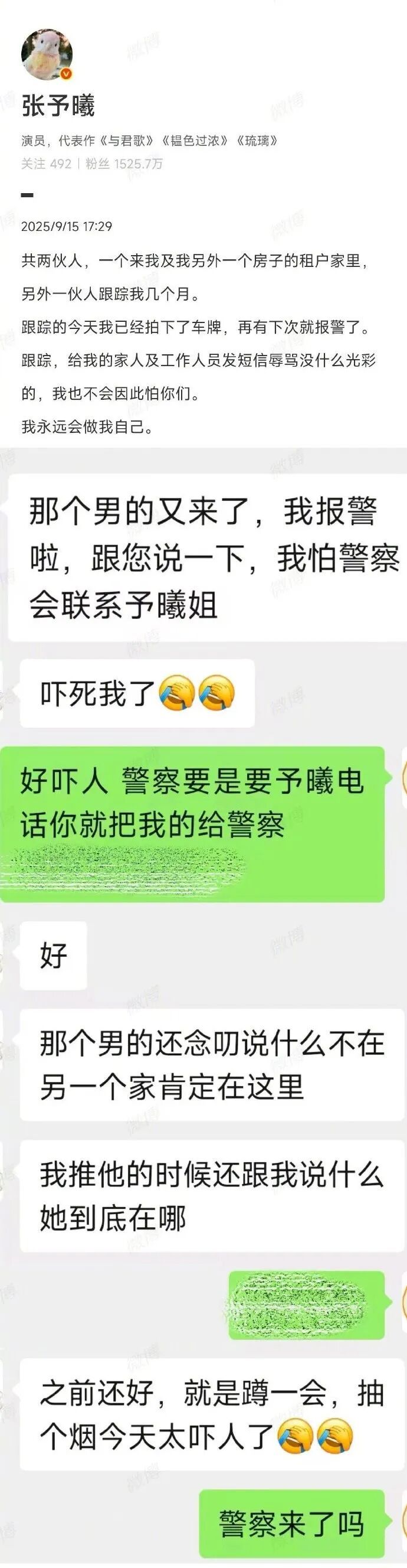 9月15日,演员张予曦发博自曝被人跟踪,张予曦透露自己被男子进到家里和租户的家中,聊天记录显示“那男的又来了”;还有一伙人跟踪了她几个月,她警告对方:“再有下次就报警了。”