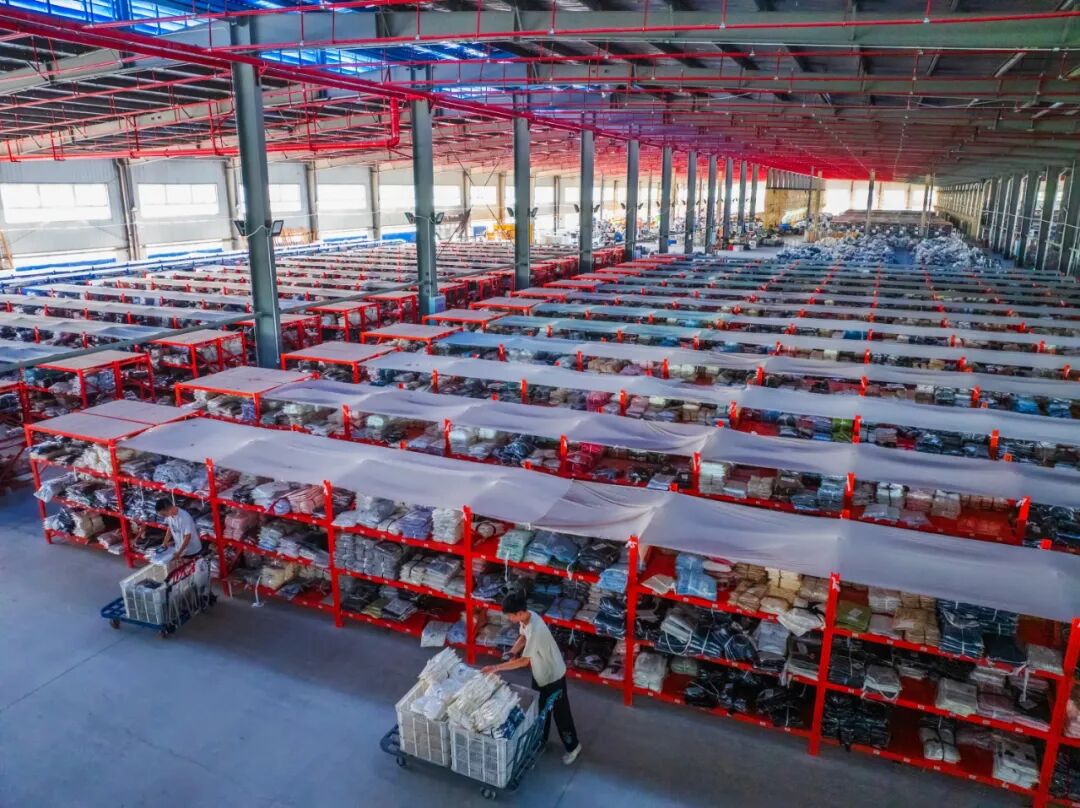 十多分钟车程外的起点产业园内一间仓库里,工人们也在忙碌着:整理衣物、分拣订单、打包封袋,为货物发出做准备。