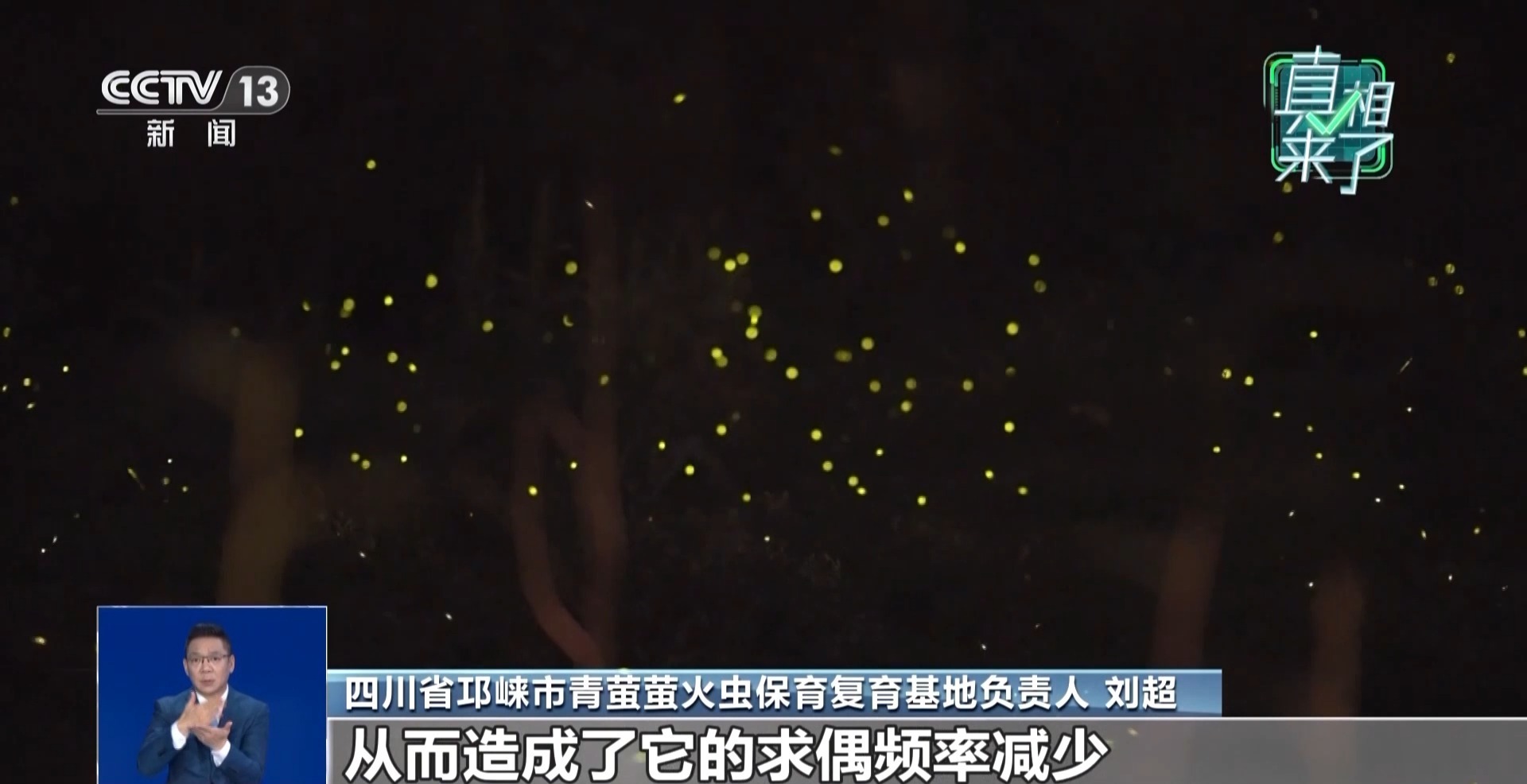 四川省邛崃市青萤萤火虫保育复育基地负责人 刘超:大量的城市的灯光,汽车的灯光,包括各种各样的霓虹灯、射灯,会造成萤火虫没有办法去识别求偶信号,从而造成了它求偶的频率减少。