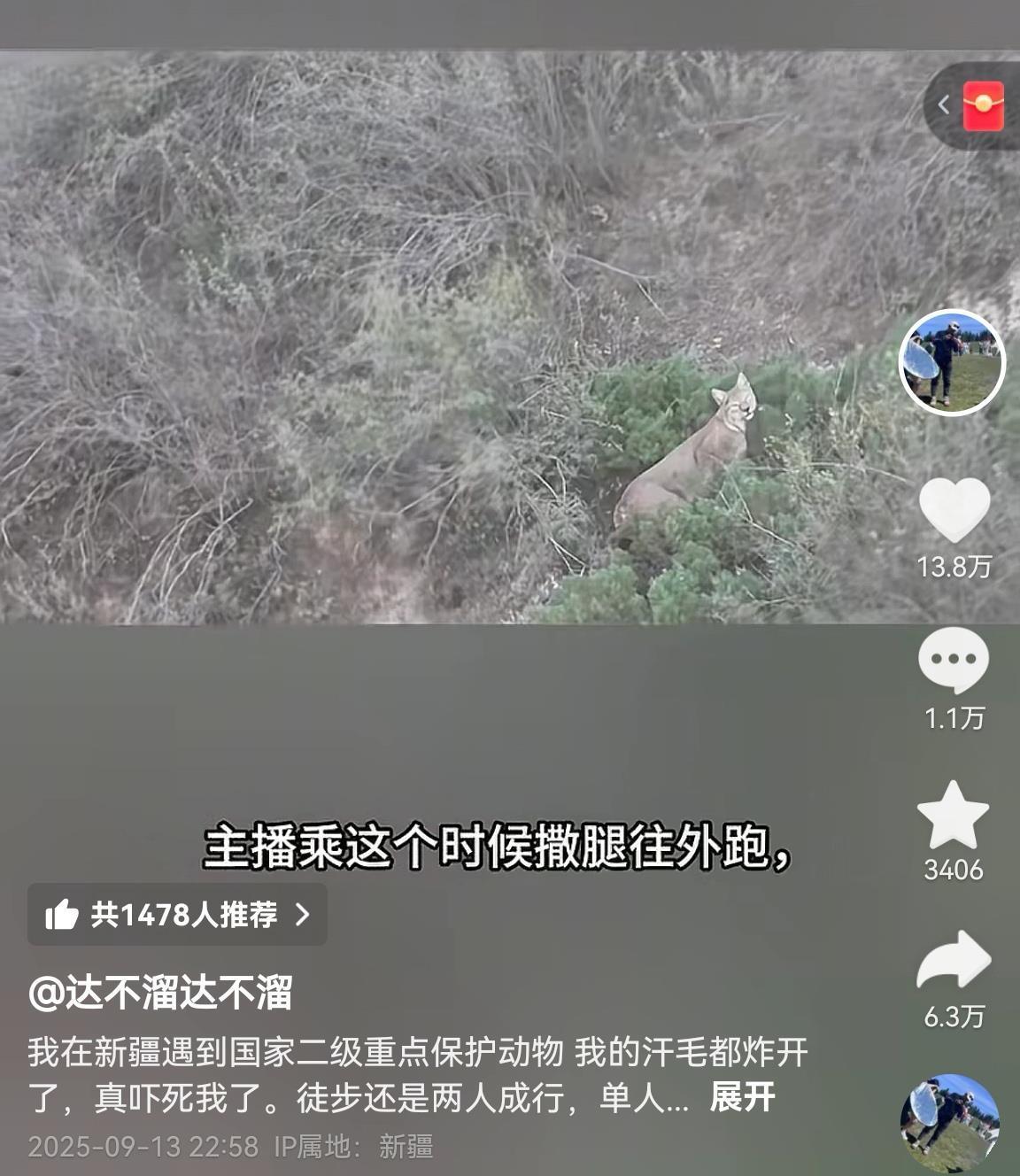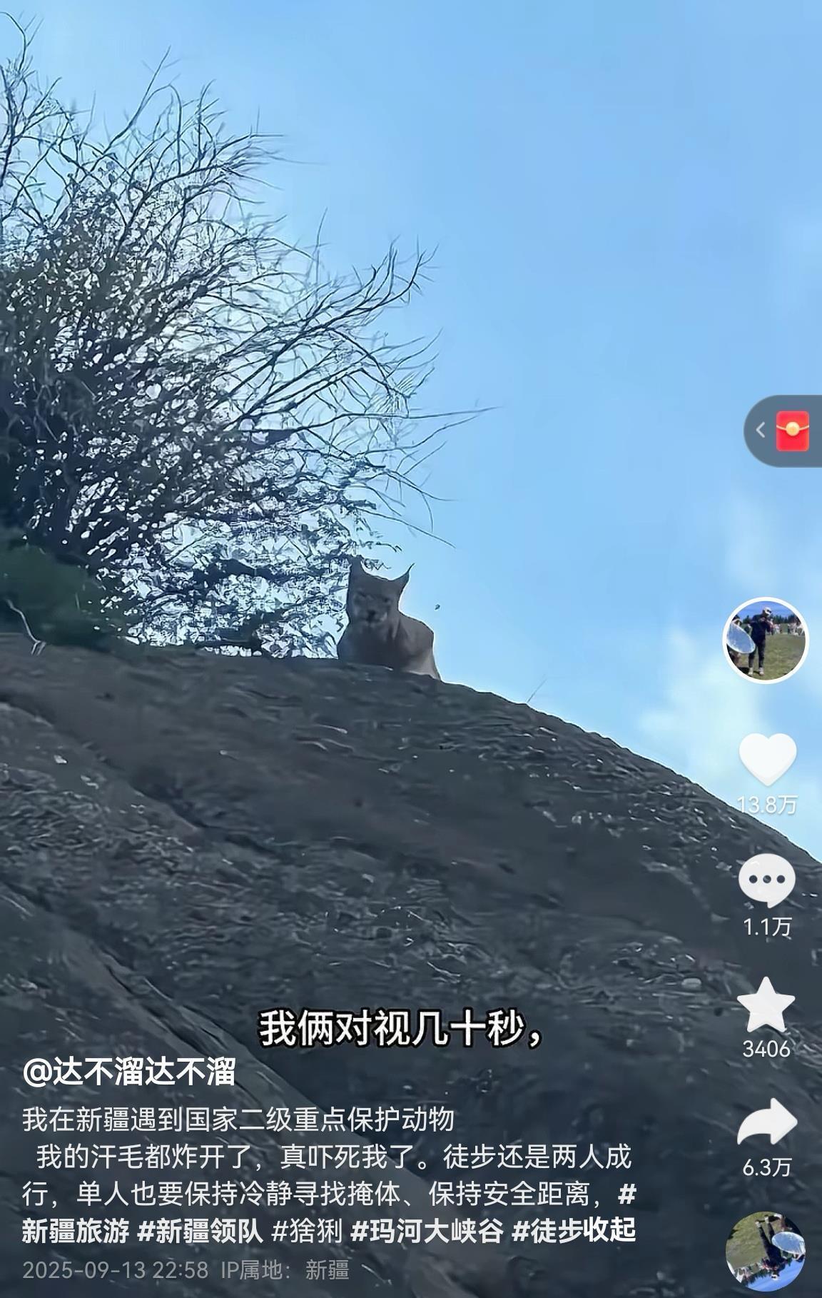 有游客日前发视频称,他在新疆玛河大峡谷一个人徒步时,遇到国家二级保护动物猞猁,“汗毛都炸开了,真吓死我了!”。