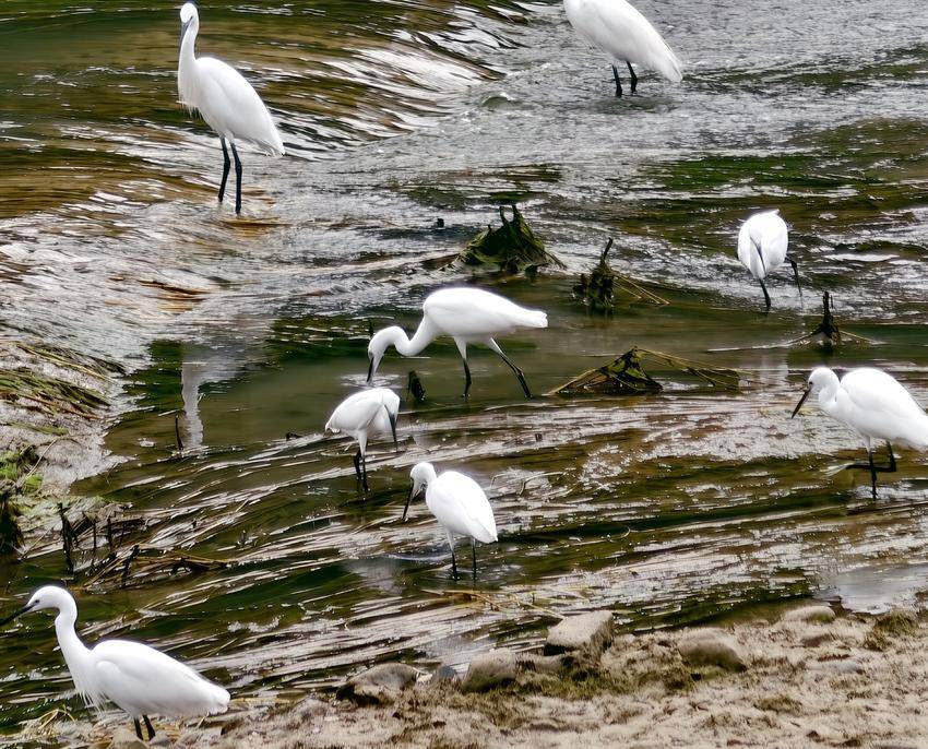 清晨,漫步于昭君广场外的香溪河畔,微风轻拂,碧波温柔荡漾,天光云影在河面交织,仿佛一幅徐徐展开的灵动画卷。忽然,一阵清越的鸟鸣声如灵动的音符般飘入耳中,抬眼望去,三十余只白鹭在浅滩之上翩然起舞。它们时而优雅低头,精准迅速地啄食水中鱼虾;时而振翅高飞,掠过波光粼粼的水面,洁白的羽翼在阳光下泛着柔和光泽,恰似散落人间的云朵,将这片水域装点得如梦似幻。