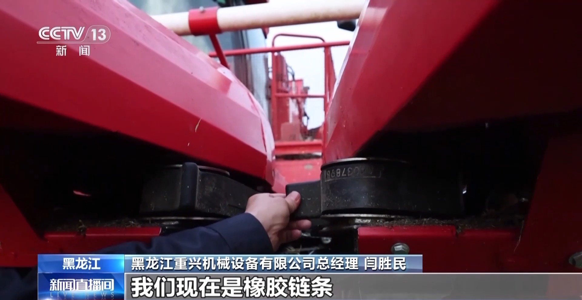 黑龙江重兴机械设备有限公司总经理 闫胜民:普通的玉米收割机的链条是铁链条,我们现在是橡胶链条,你看它非常柔软,它对玉米的碰撞很小,保护它不收硬伤。