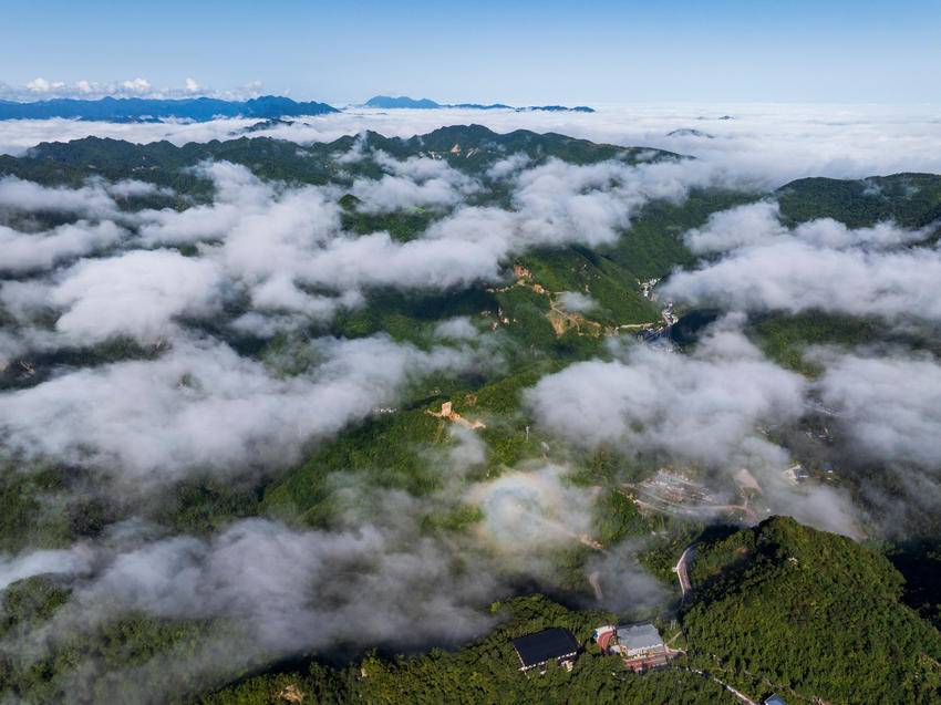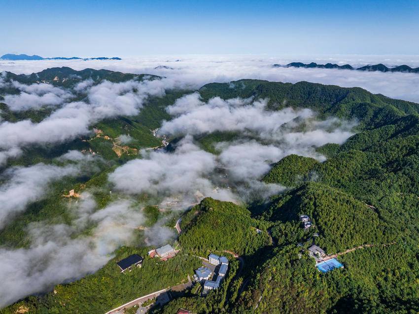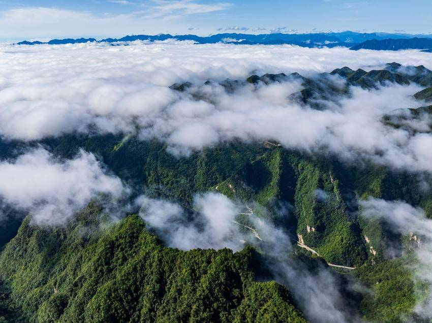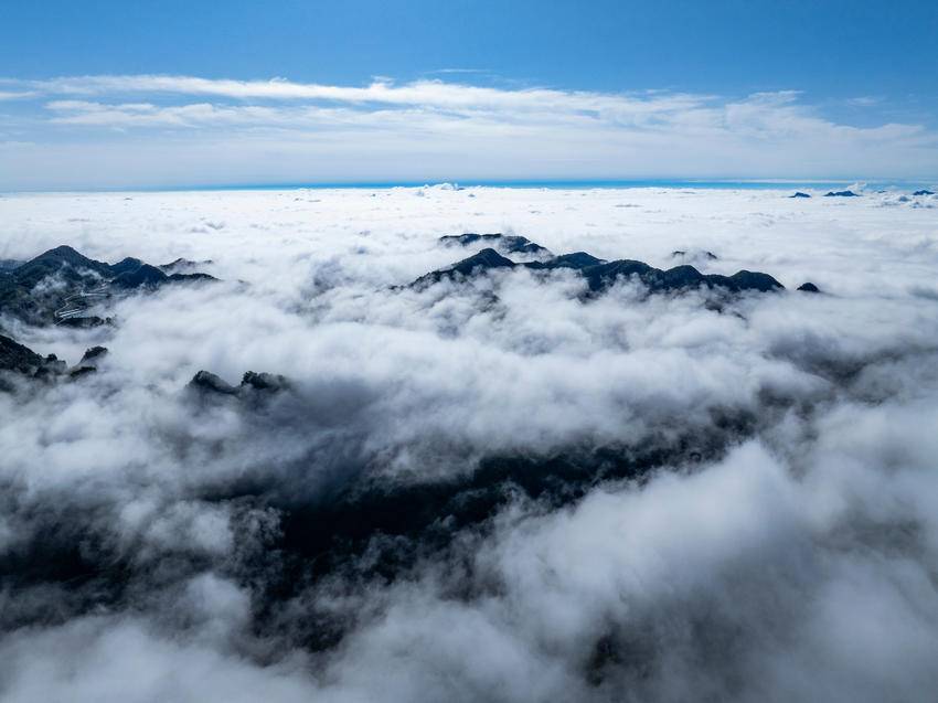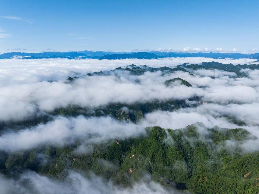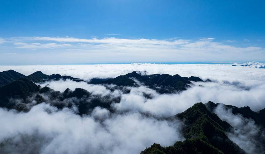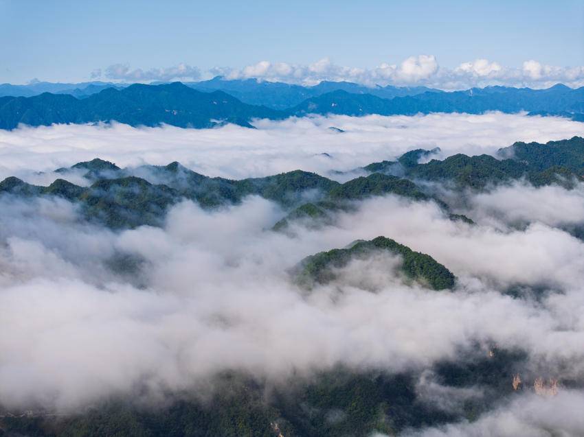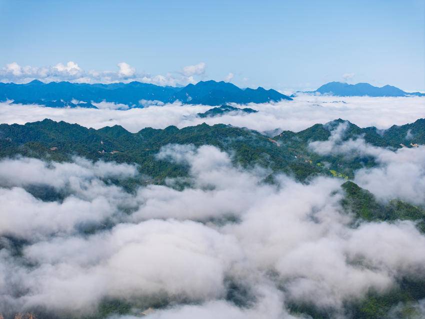 近日,雨后初晴,海拔1700多米的保康县马桥镇尧治河村梨花山出现云海景观,山峦间云雾缭绕,层峦叠嶂交相辉映,云潮涌动,宛如仙境。