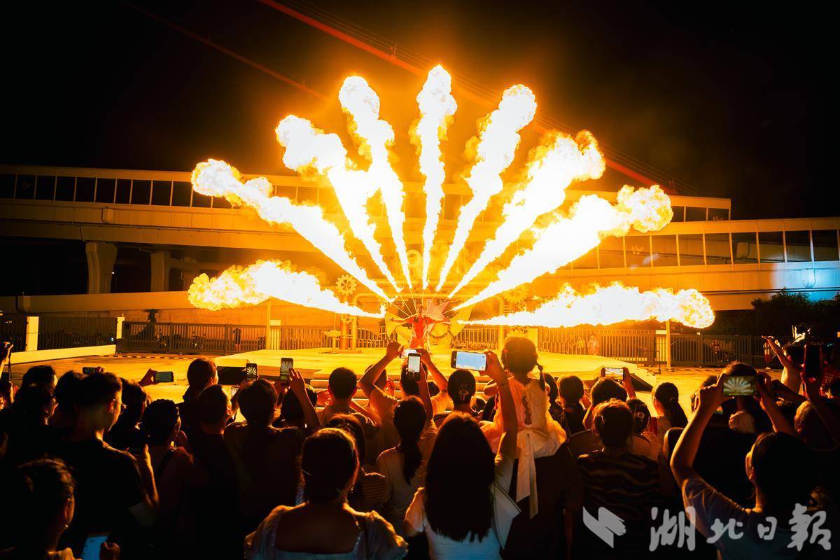 当佳肴抚慰了味蕾,夜色下的精彩才刚刚拉开帷幕。今年,西坝不夜城全新推出系列夜游演艺,为“烟火气”增添了更多“诗意”与“活力”。大型半室内主题情景演艺《宜昌1938》,借助真人实景演出,并运用全息投影、裸眼3D等先进技术,生动再现当年宜昌大转运的壮阔史诗,让游客在沉浸式体验中感受历史的厚重。除了主题演艺,景区还打造了六大节点式、多场景互动表演,既有火壶、火立方等展现东方火焰美学的精彩演出,也有机械霓虹与传统飞天舞蹈相融的赛博敦煌,还有充满复古氛围的Disco街头派对,涵盖历史文化、非遗演出、科技光影秀、互动情景剧等多种形式,真正实现“移步换景、步步惊喜”。
