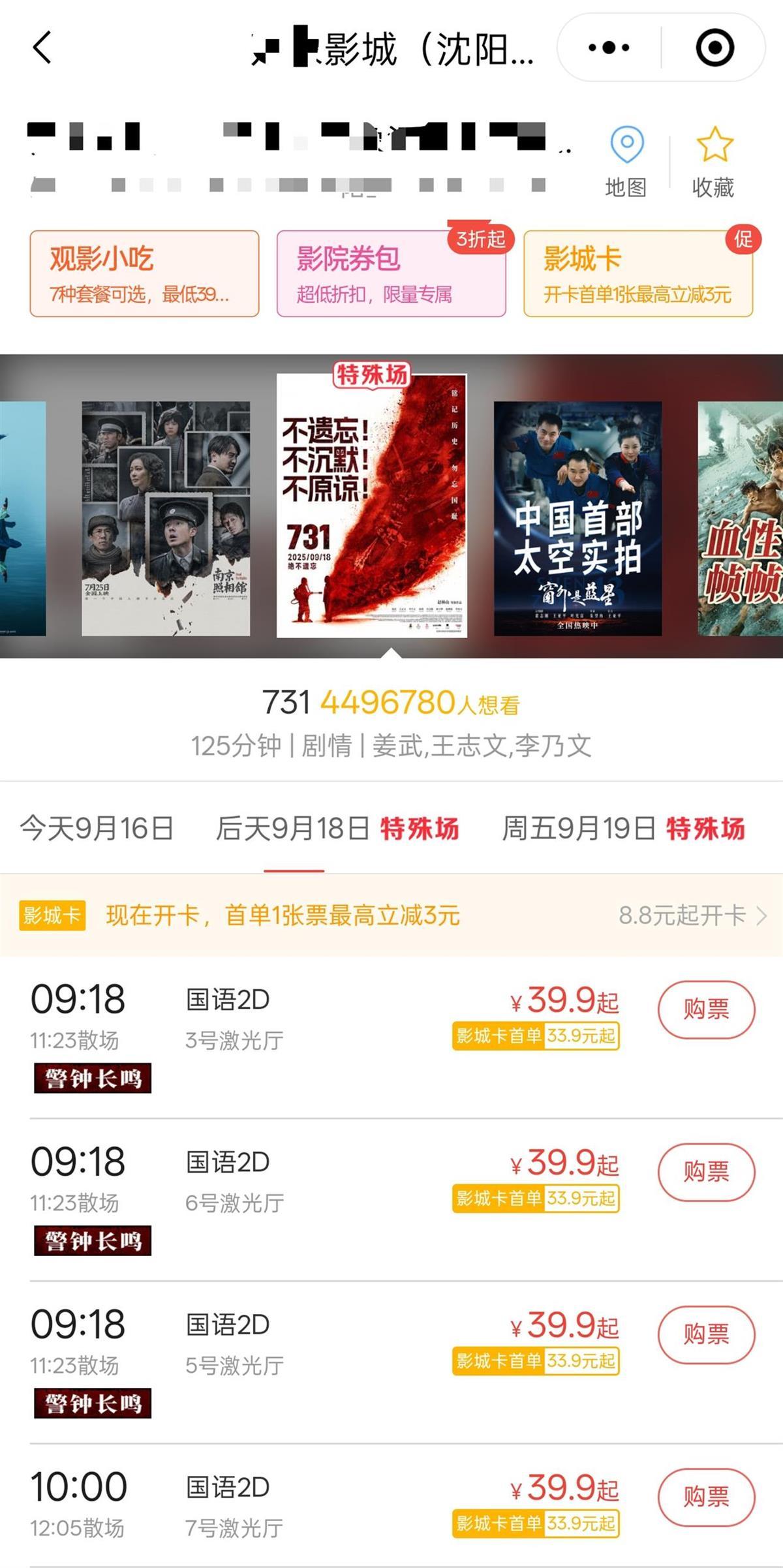 9月16日下午,极目新闻记者注意到,国内多地影院的排片表显示,《731》首场放映时间定在了上午9点18分,并注有“警钟长鸣”的标识。