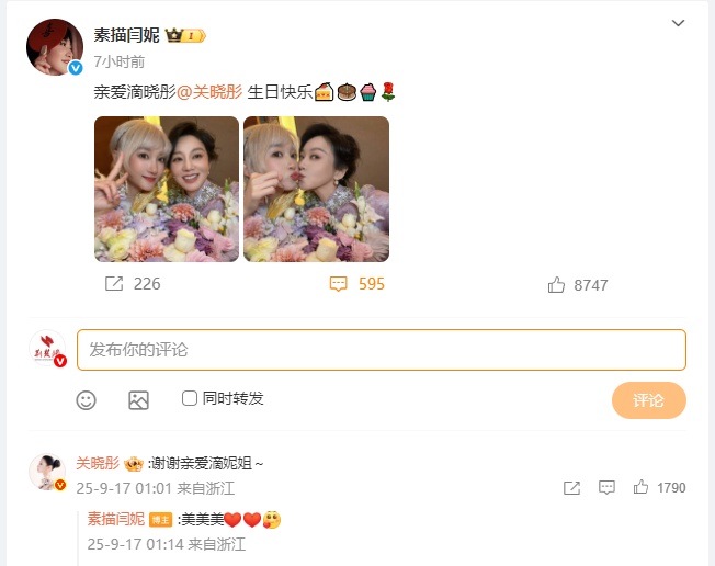 2025年9月17日,关晓彤迎来28岁生日,@素描闫妮 发博为关晓彤庆生:“亲爱滴晓彤@关晓彤 生日快乐 ” 关晓彤在评论区回复感谢:“谢谢亲爱滴妮姐~“