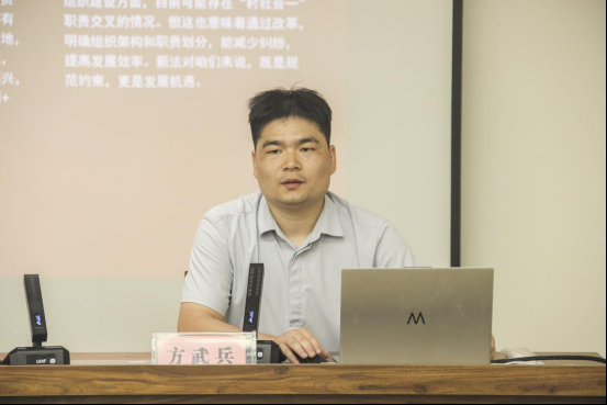 “《中华人民共和国农村集体经济组织法》不仅为农村集体经济组织赋予了‘特别法人’身份,使其能够以独立主体参与市场经济活动,更是一部规范集体经济运行、保障农民权益的‘操作指南’。”方武兵结合盘龙城街道实际情况,指出当前在‘三资’(资金、资产、资源)管理、产业发展和组织建设中存在的典型问题,并提出了依法治理的建议。