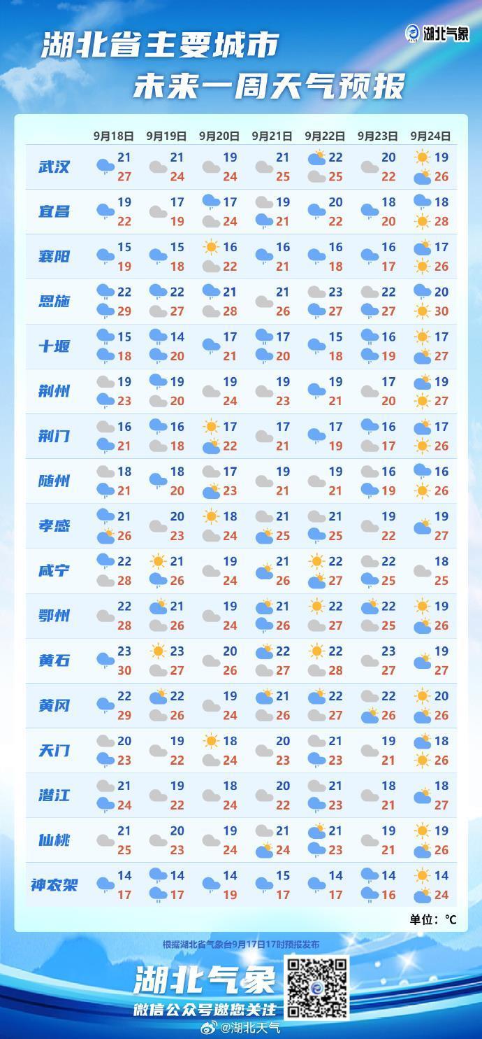 比如,周四十堰气温15-18℃,襄阳15-19℃,神农架14-17℃,随州18-21℃,周五荆门16-18℃、宜昌17-19℃,天门19-22℃。