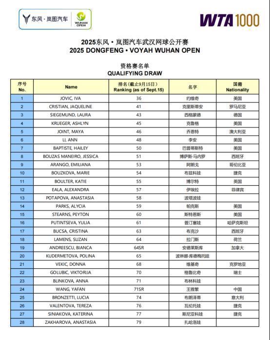 9月18日,2025东风·岚图汽车武汉网球公开赛资格赛名单公布,阵容星光熠熠,中国金花王雅繁入围,前美网冠军安德莱斯库在列,还有一众今年女子网坛备受瞩目的新星出战。她们将向8个晋级正赛的名额发起冲击。