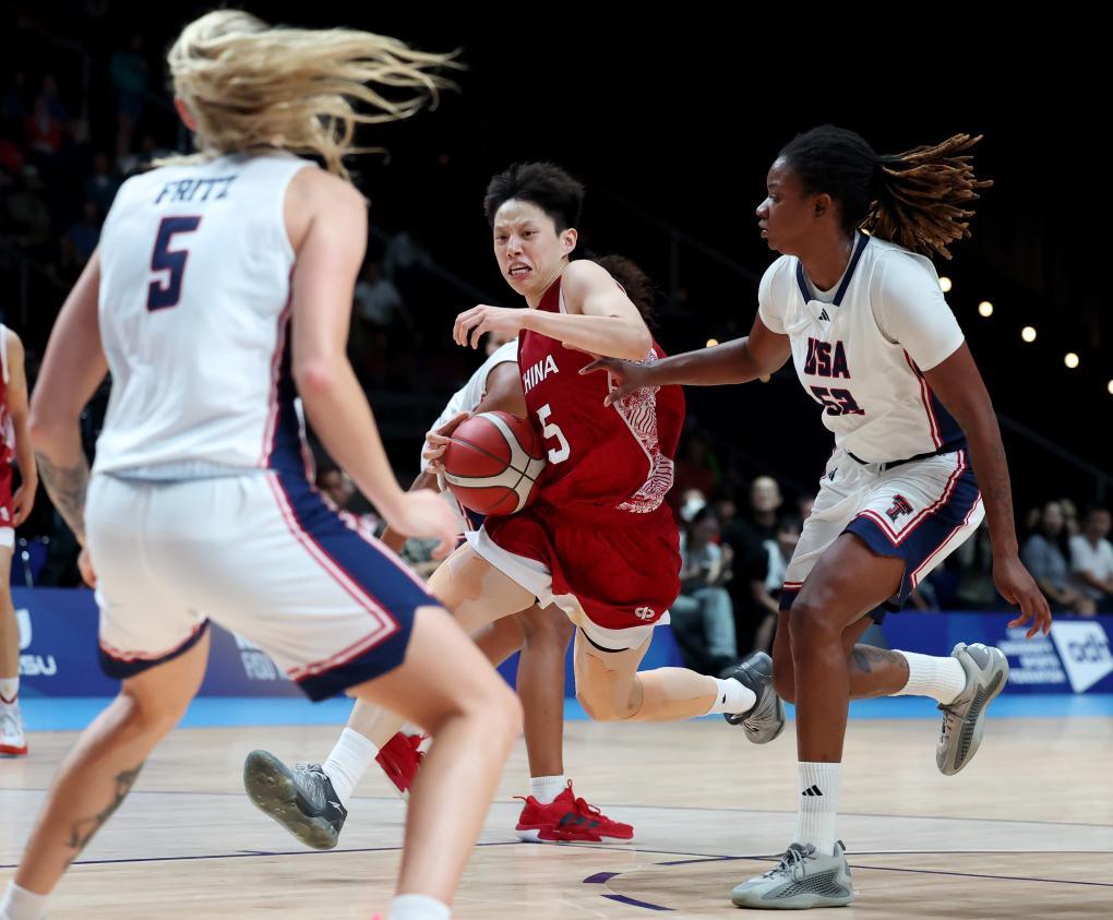 7月25日,中国队球员田媛媛(中)在2025年德国莱茵-鲁尔世界大学生夏季运动会女篮决赛中带球突破。新华社记者 张晨 摄
