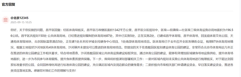 针对网友的建议,北京市昌平区回复表示:经昌平区体育局核实,全区共规划150处公共体育用地,已经推进规划编制的体育用地87处,其中已实施5处,正在实施2处,已建成昌平体育馆、昌平体育场、回龙观体育文化公园、天通苑体育馆地块、北京国际温泉酒店5处,正在建1处未来科学城全民健身中心项目、1处南邵体育用地项目。昌平区体育局已于去年召开全区各镇街会议,梳理87块体育用地情况,根据土地现状沙河地区有4块体育用地。