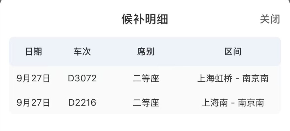 3.添加更多候补车次后,在确认候补订单页面的最上方,可以查看全部候补车次信息,包括日期、车次、席别、区间。