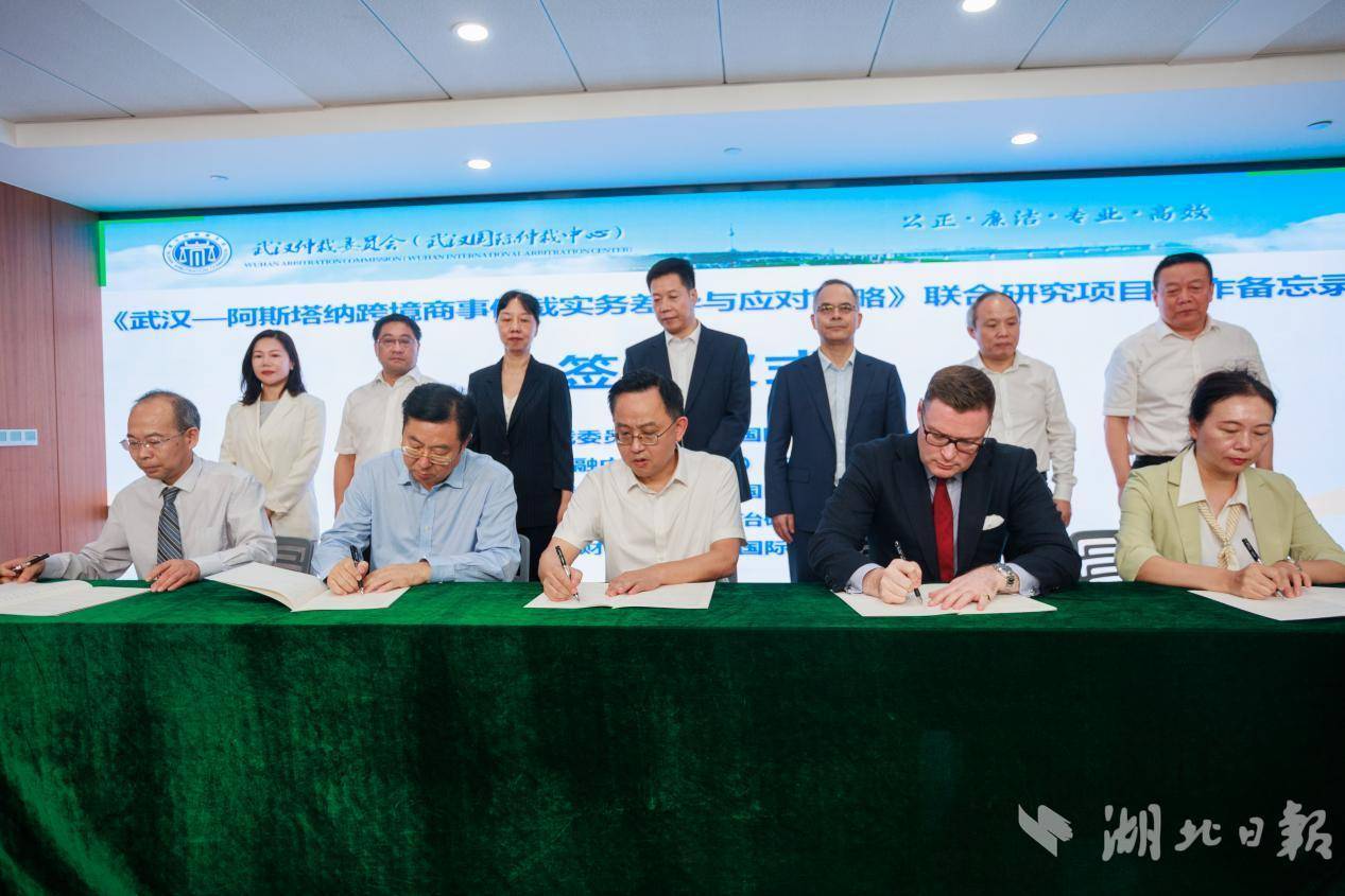 签约仪式上,武汉仲裁委员会(武汉国际仲裁中心)、阿斯塔纳国际金融中心(AIFC)法院与国际仲裁中心、西安仲裁委员会(西安国际仲裁中心)、武汉大学国际法治研究院、中南财经政法大学国际法学院五家机构代表共同签署《武汉—阿斯塔纳跨境商事仲裁实务差异与应对策略》联合研究项目合作备忘录。武汉产业创新发展研究院等机构代表见证了备忘录的签订。
