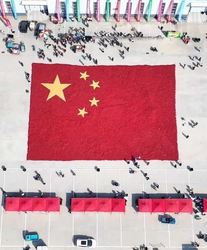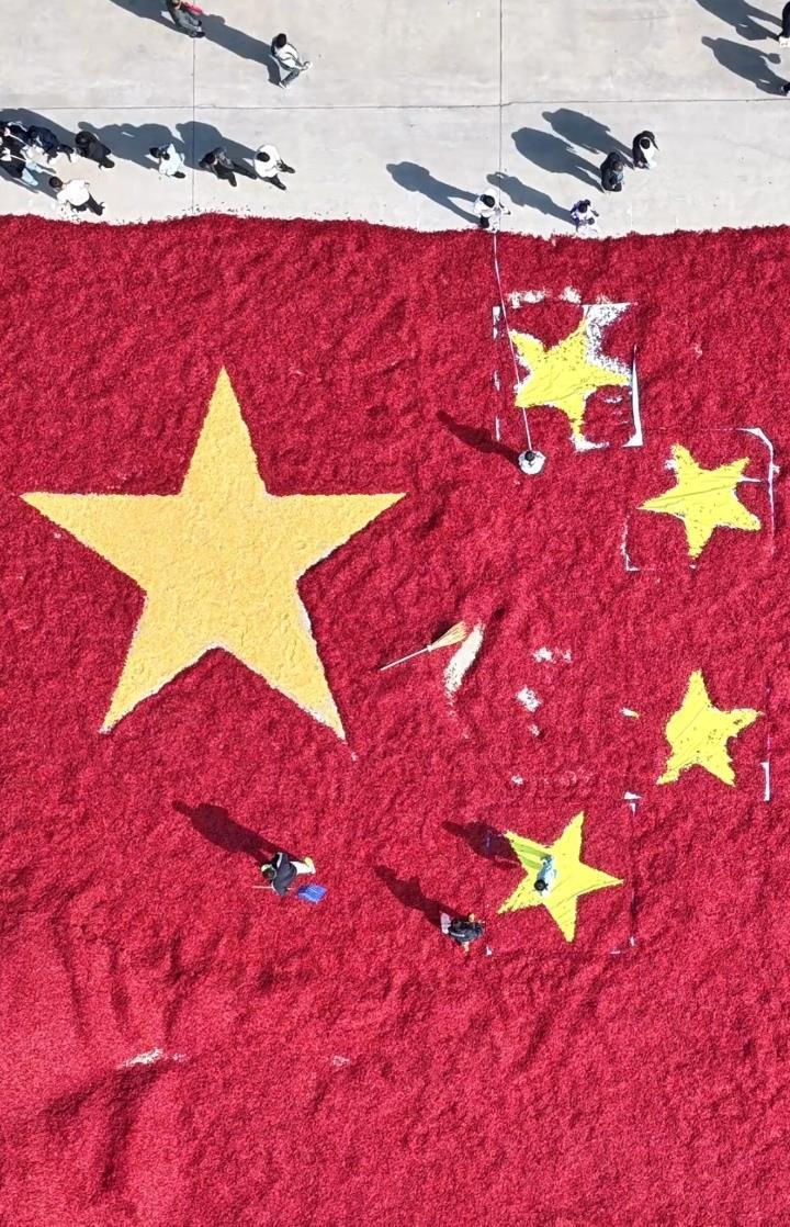 9月19日,内蒙古巴彦淖尔市一辣椒种植大户,用11吨干辣椒、500斤玉米粒,拼出面积约1000平方米的巨型五星红旗,表达特殊的丰收之喜。