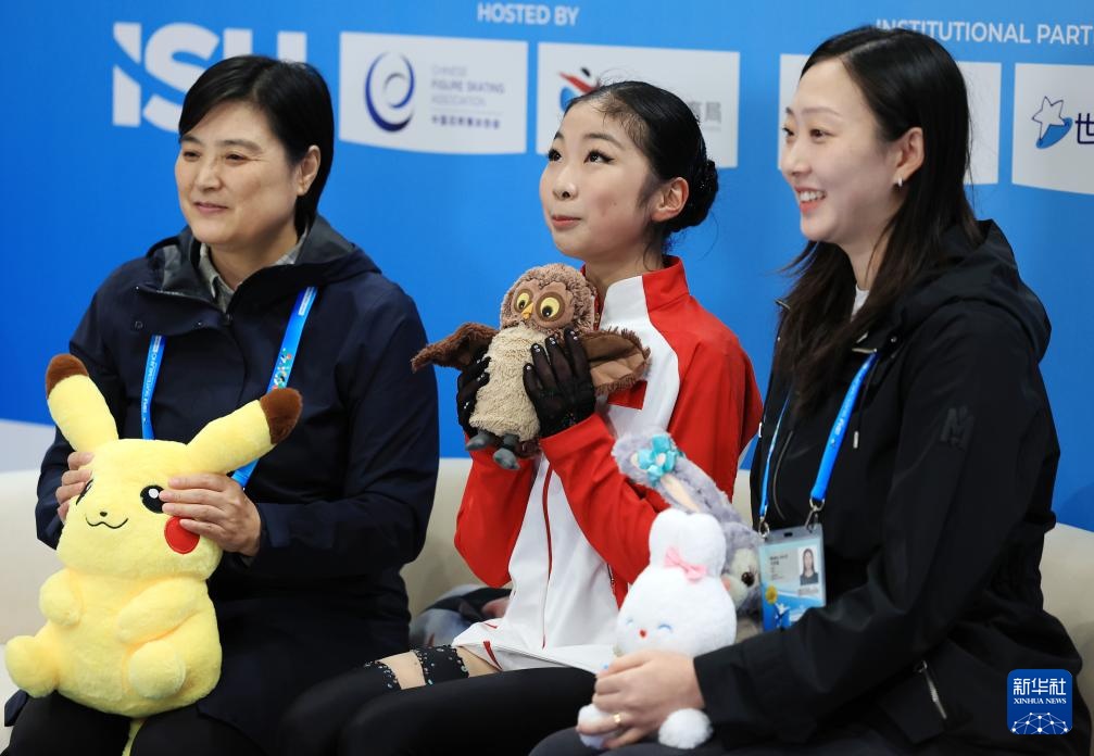 9月19日,中国选手张瑞阳(中)在女子单人滑短节目比赛后等待成绩。赛后她暂列第四。