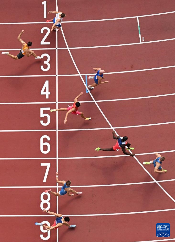 9月20日,中国选手费翔(右四)在100米比赛中冲过终点。