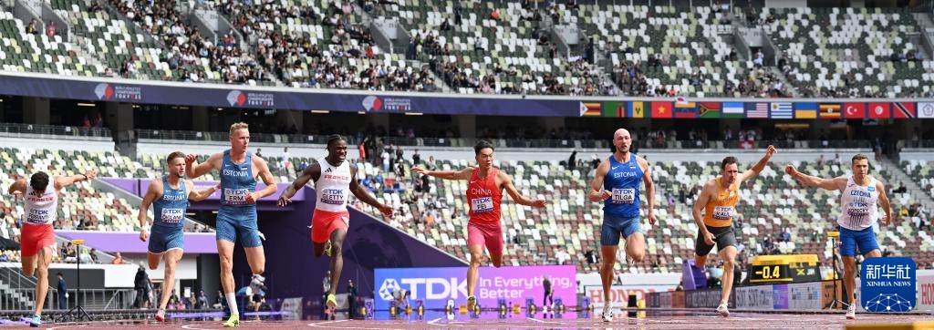 9月20日,中国选手费翔在100米比赛中冲过终点。