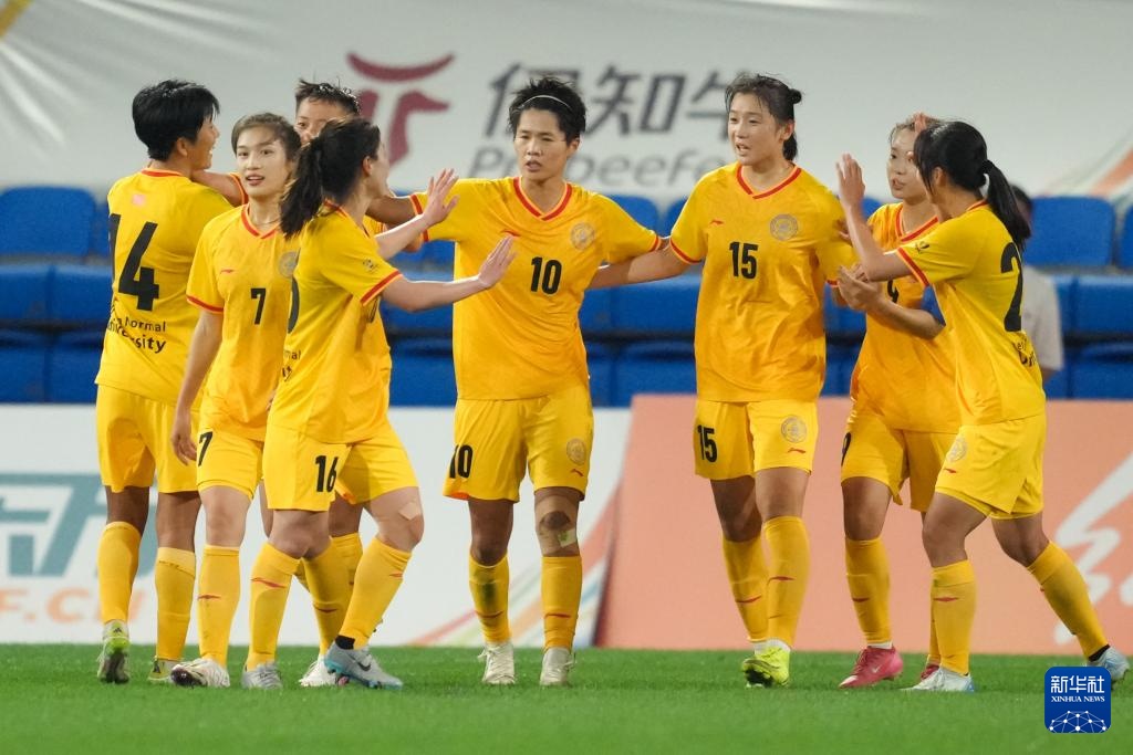 9月19日,北京师范大学女足球员周心雨(中)进球后与队友庆祝。