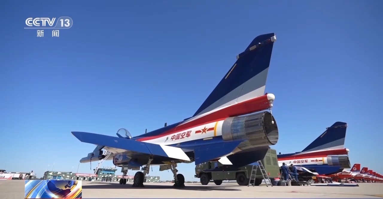 张烈林:表演机的涂装主要用了红、白、蓝三种颜色,蓝天、白云和中国红,把空军的要素和中国的要素都有机地融合起来了。