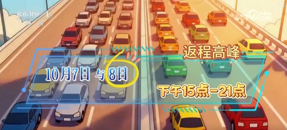 返程高峰集中在10月7日与8日,下午15:00—21:00,交通压力较大,尤其8日最集中。主要拥堵路段预计出现在G4京港澳高速(广州—深圳方向)、G2京沪高速(苏州—上海方向)、G6京藏高速(北京进京方向)、G50沪渝高速(重庆—湖北方向)等。建议大家根据自己的实际需求错峰出行和返程。