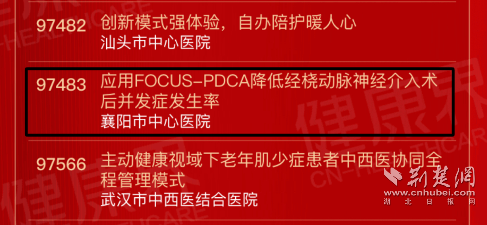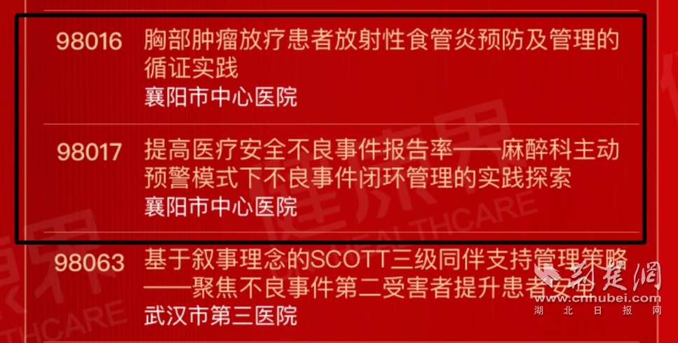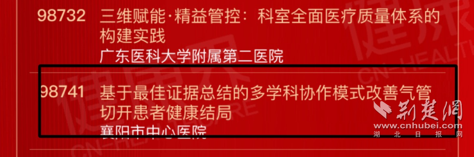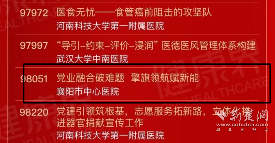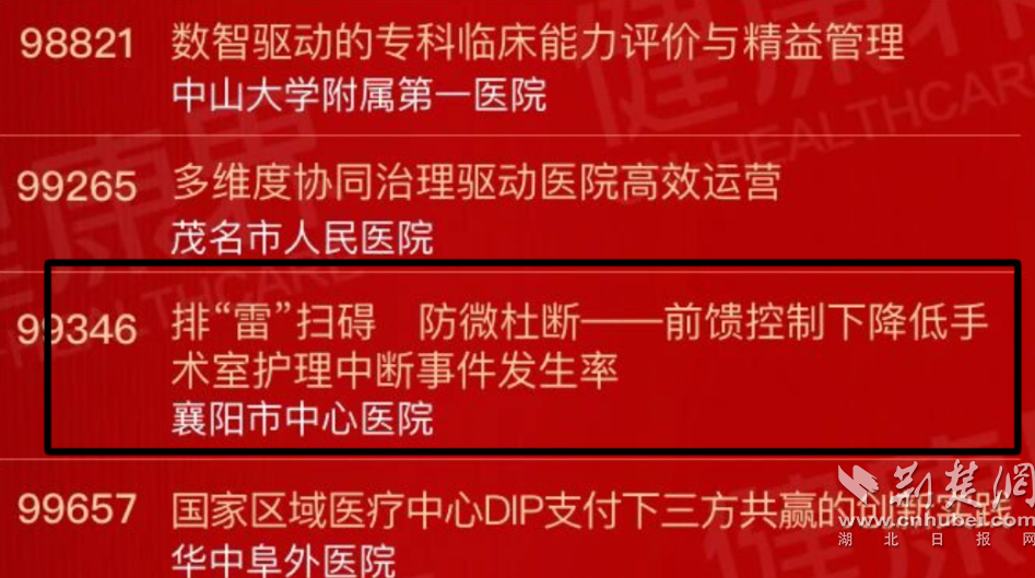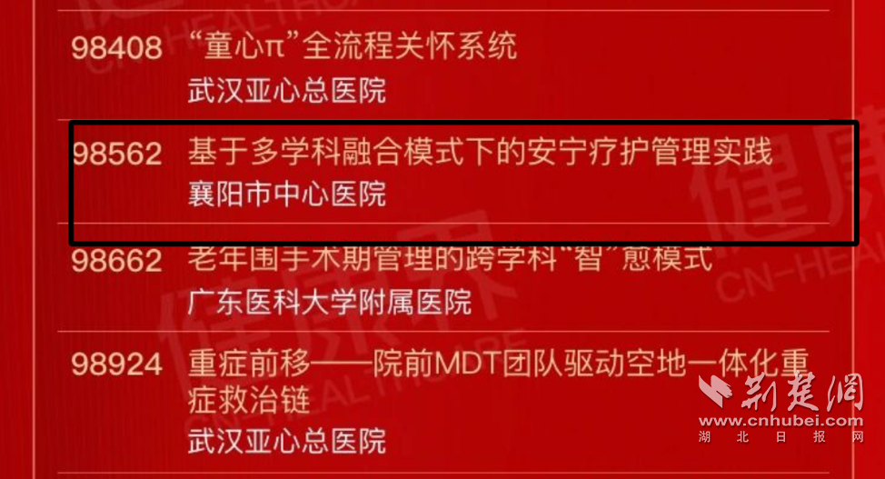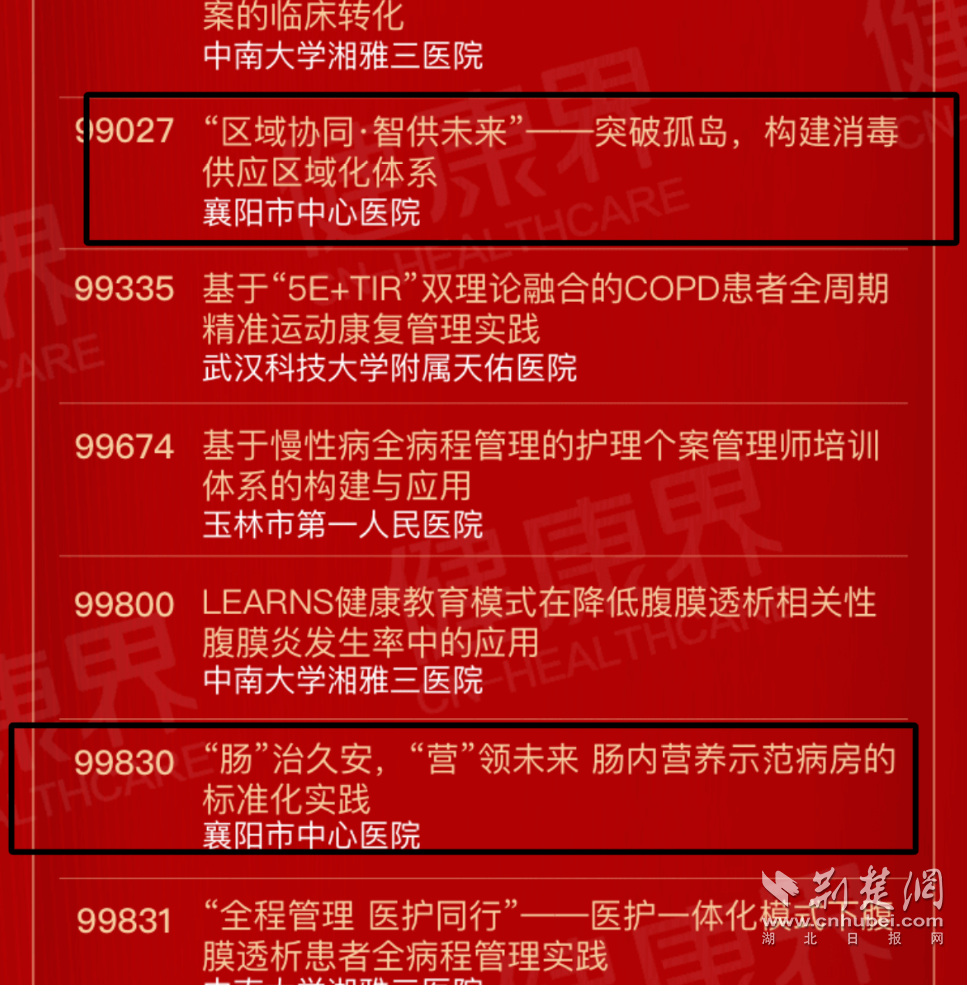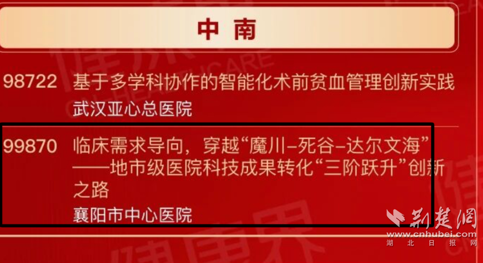 荆楚网(湖北日报网)讯(通讯员 钟心宣)近日,由健康界主办的第九季中国医院管理奖区域优秀奖榜单正式公布,襄阳市中心医院申报的10个项目分别在党建文化、科技创新、质量管理、学科建设、护理管理、运营管理等六大主题(中南地区)获奖。
