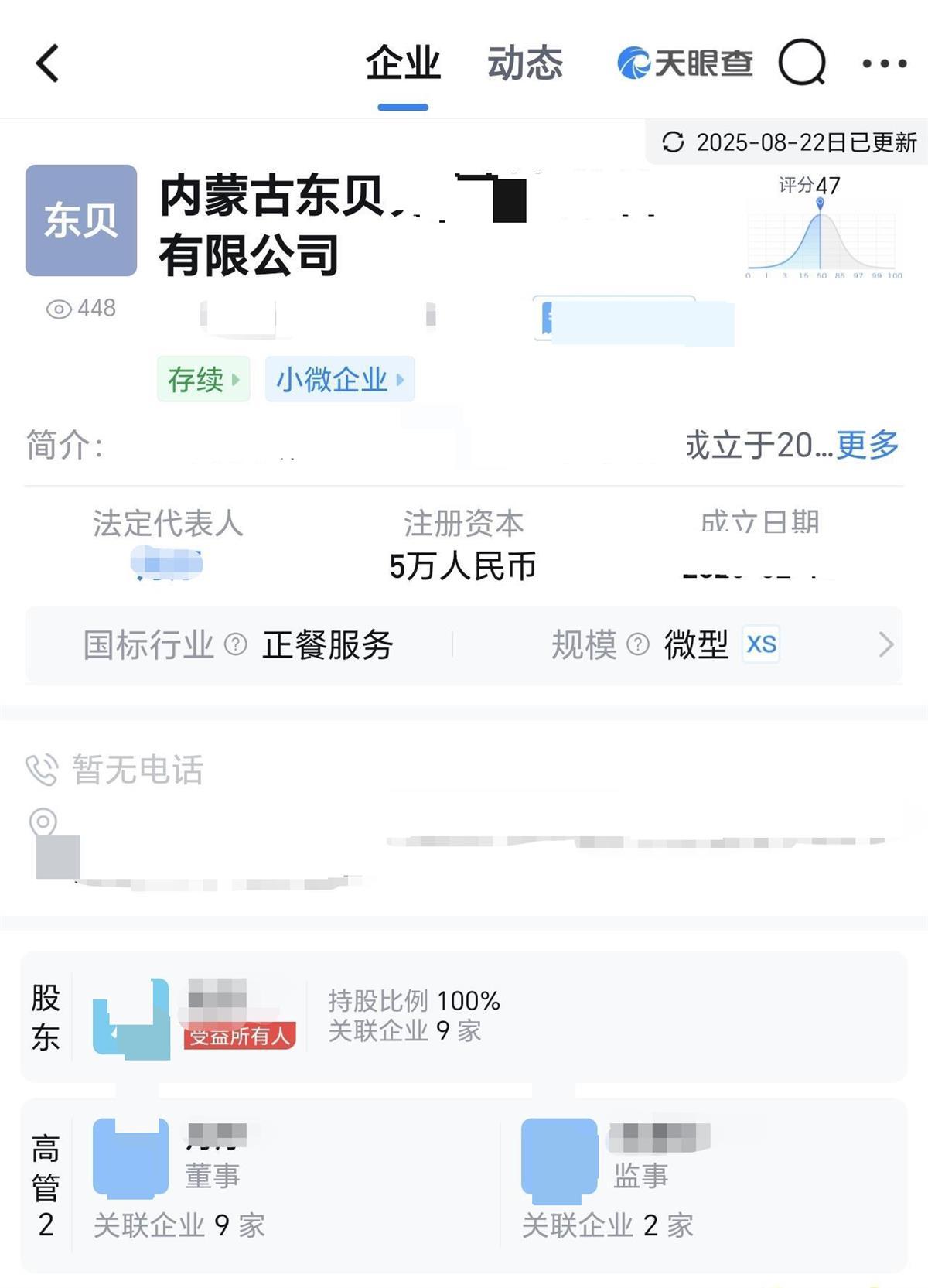 9月21日,极目新闻记者在天眼查上以“东贝”为关键词搜索看到,内蒙古自治区通辽市确实有一家名称中带有“东贝”的小微企业,注册资本为5万元,成立日期为2025年2月13日,随后,记者联系到该公司,一名服务员称,他们餐馆主营荞面,也有炒菜等中餐,“都是现做的,不是预制菜”,目前只有一家门店,至于其他情况,由于他不是老板,因此也并不清楚。该公司老板表示,在这次与西贝有关的网络争议数月前,餐馆就已经开业了,取“东贝”这个名字也和“西贝”没有关系,“我们也没有对外宣传的想法”。