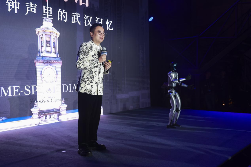是夜,江汉关钟声悠扬,仿佛带领现场百余名嘉宾穿越百年烟云。随着《我的祖国》的音乐响起,活动在一场由著名主持人田野、“宇树G1”机器人带来的“历史·现在·未来”时空对话中拉开帷幕。对话从人文视角深度探讨了城市在传承中焕新、在共生中前行的发展之道,思想的碰撞点燃了现场对未来城市的无限想象。田野老师在对话中讲到:“历史的车轮滚滚向前,需要记录者,更需要思考者。百年前的江汉关前熙攘的人流,他们怀揣梦想,从这里走向世界,也让世界走进武汉。”