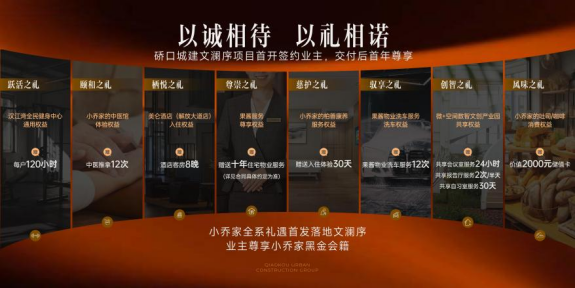 小乔家黑金会籍权益包含八大权益礼,其中最为重磅的是为文澜序项目首开业主赠送十年住宅物业服务,是武汉首次有房地产企业为项目业主提供这么“硬核”权益。