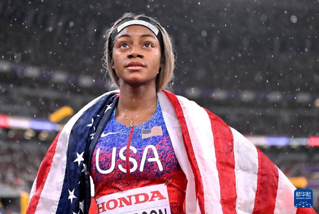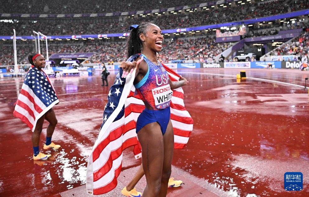9月21日,美国队第四棒选手理查森在决赛中冲过终点后庆祝。最终,美国队获得冠军。