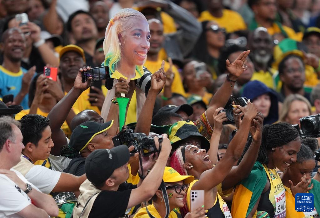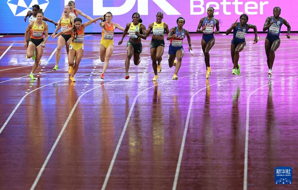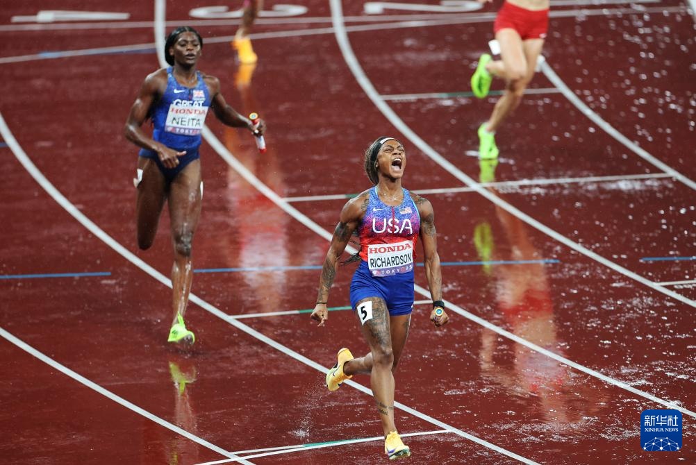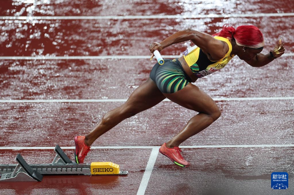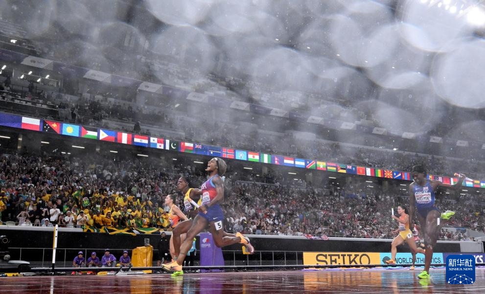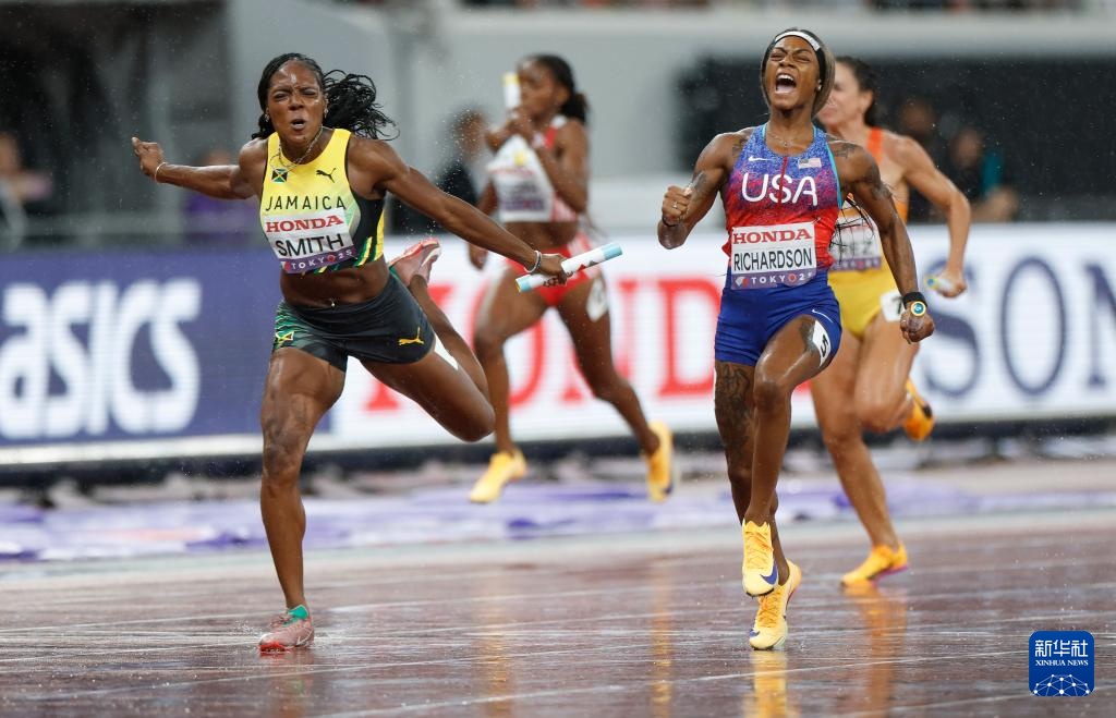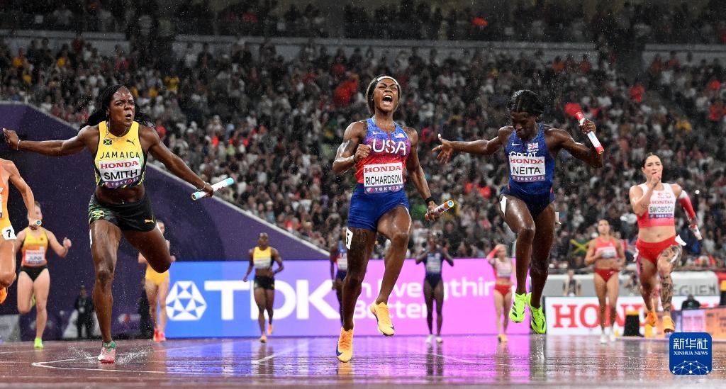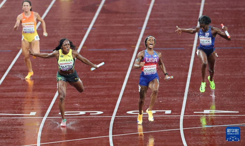 9月21日,美国队第四棒选手理查森(右四)、牙买加队第四棒选手史密斯(右六)和德国队第四棒选手吉娜(左二)在决赛中。最终,美国队获得冠军,牙买加队获得亚军,德国队获得季军。