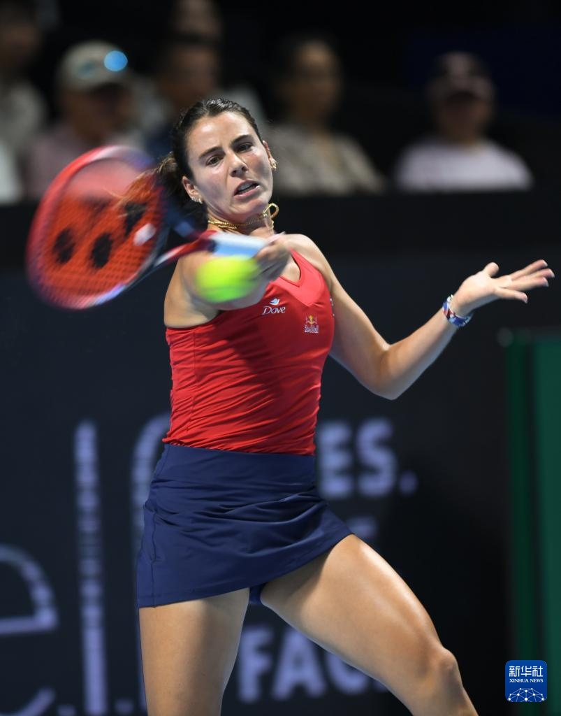 9月21日,美国队选手纳瓦罗在比赛中回球。最终,她在首场女子单打比赛中0比2不敌意大利选手科恰雷托。