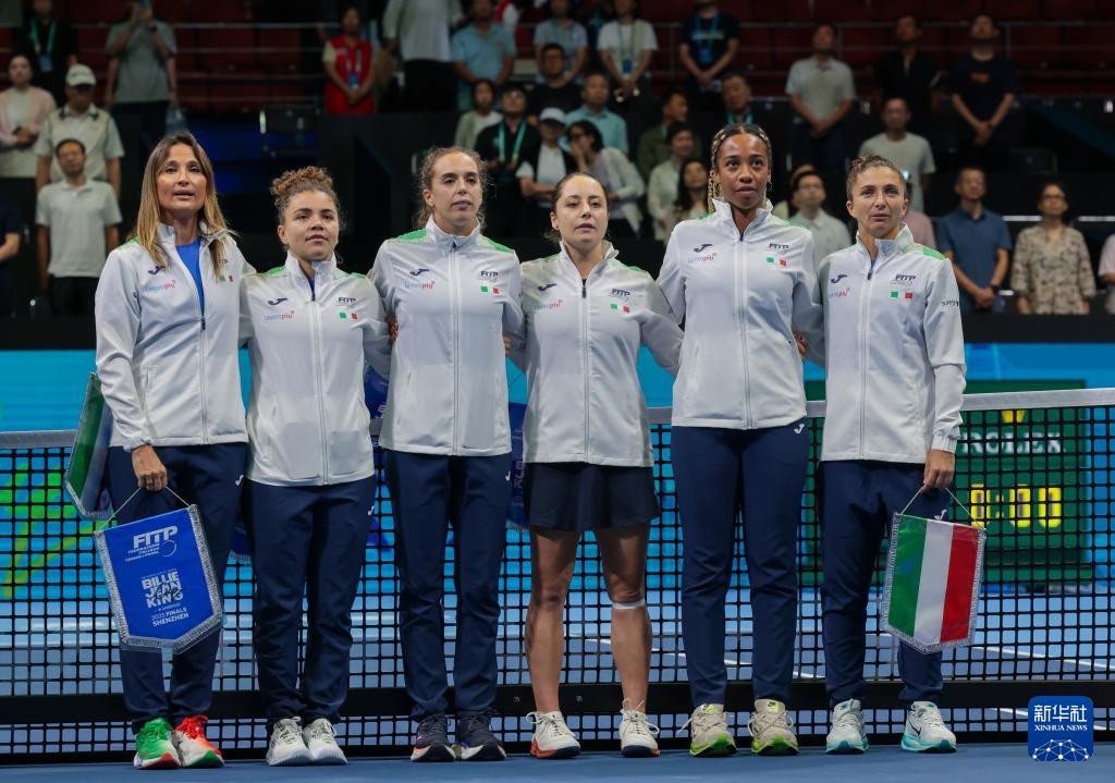 9月21日,意大利队在首场比赛后庆祝胜利。最终,意大利选手科恰雷托在首场女子单打比赛中2比0战胜美国选手纳瓦罗。
