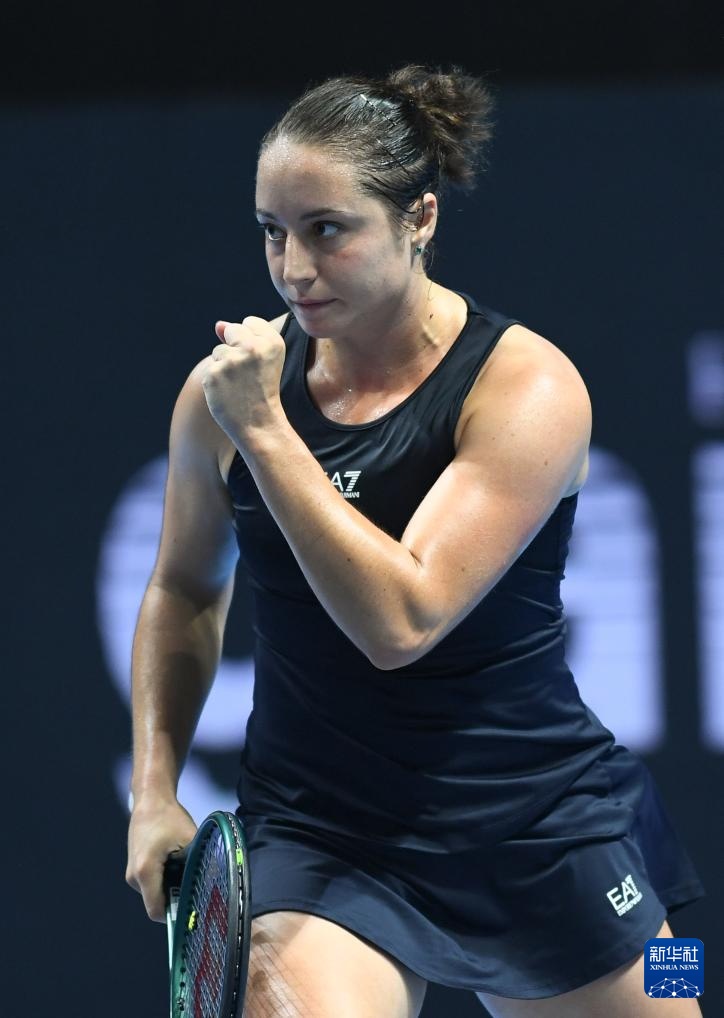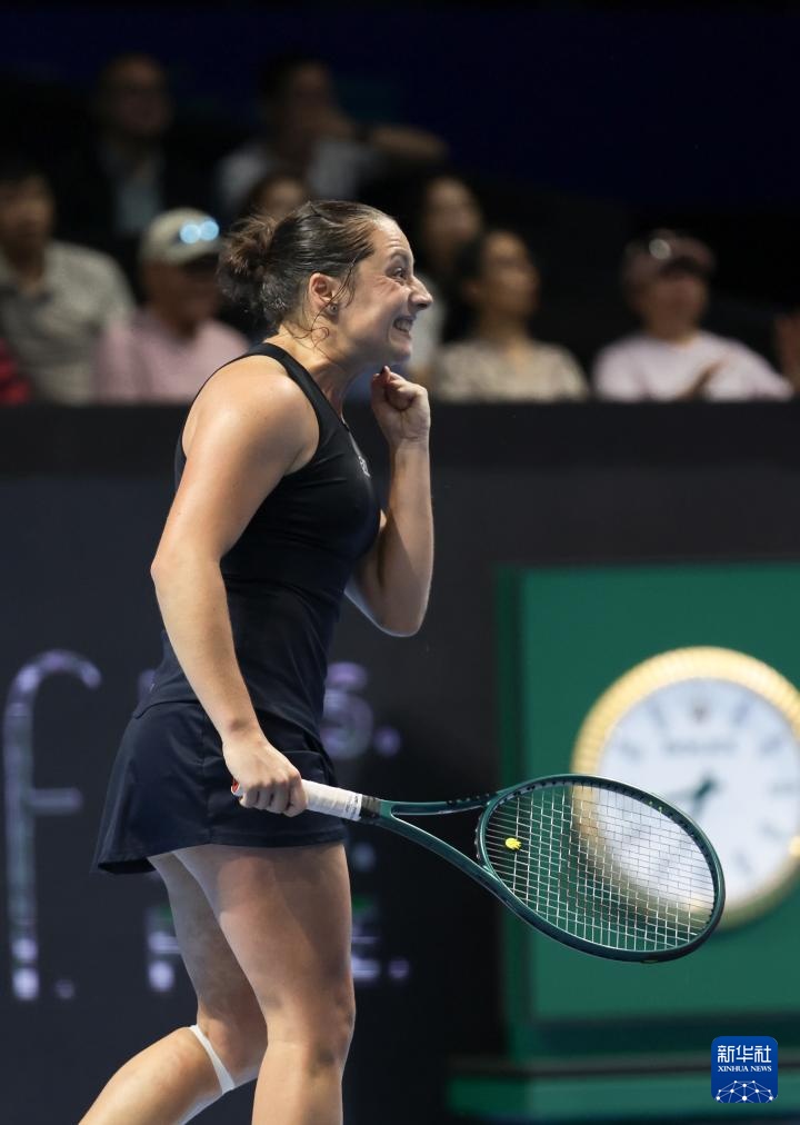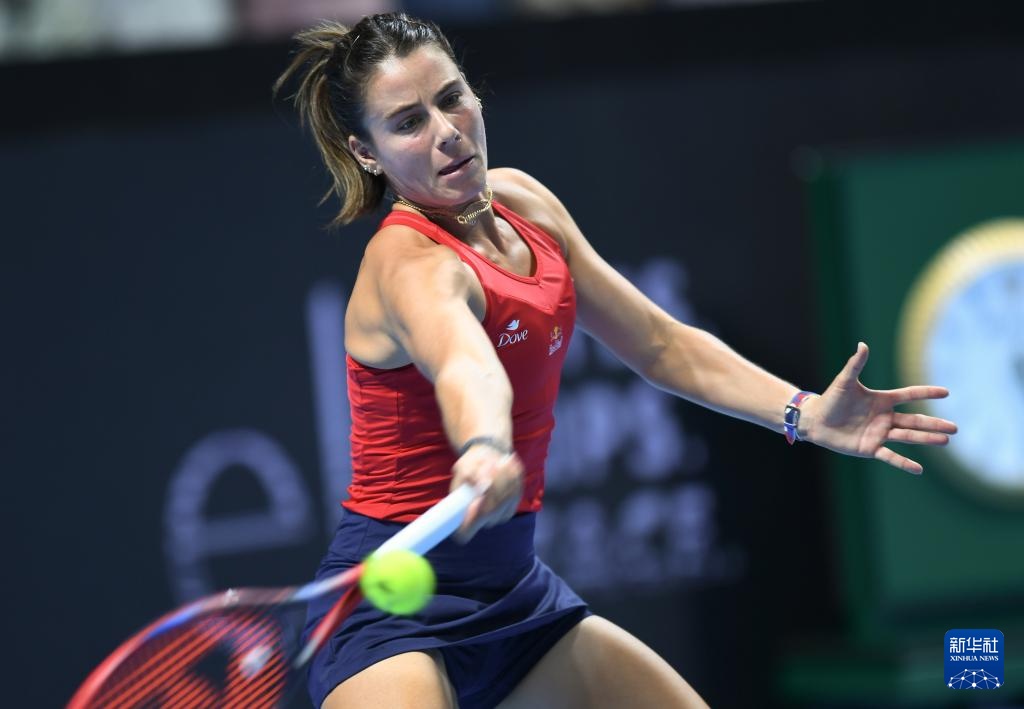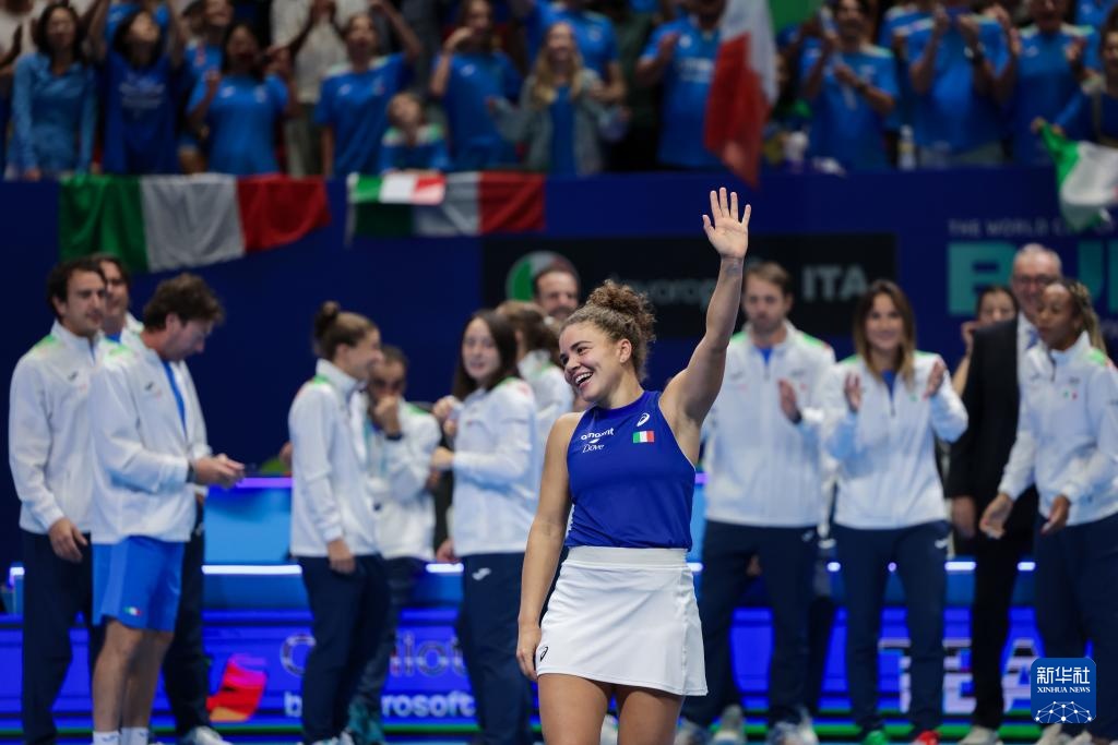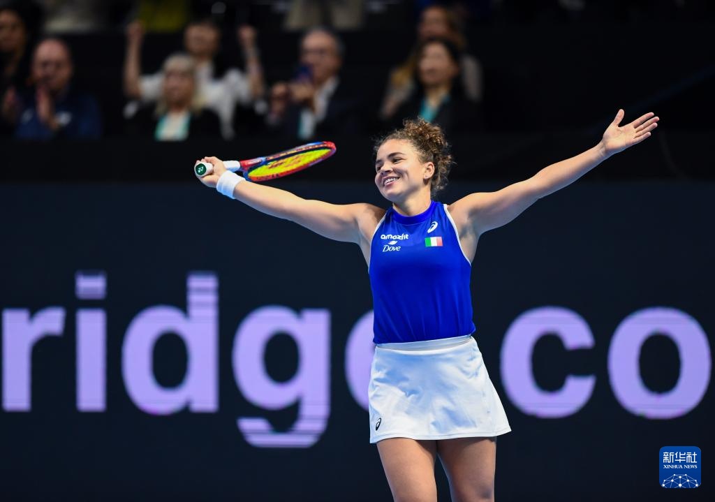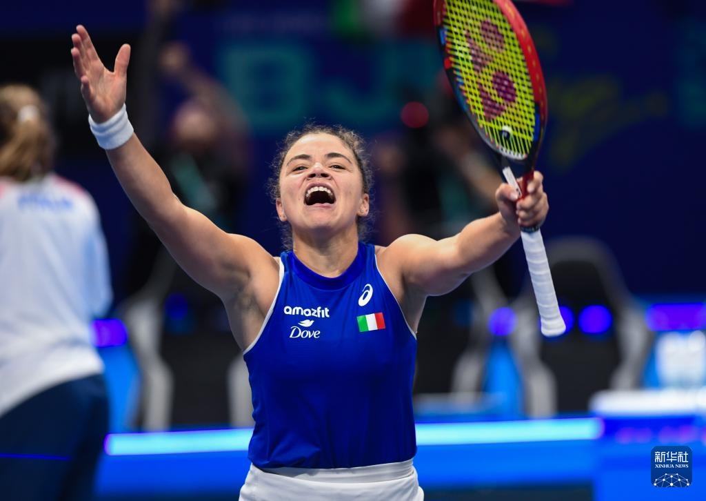 9月21日,意大利队选手保利尼庆祝胜利。她在单打比赛中2比0战胜美国选手佩古拉。