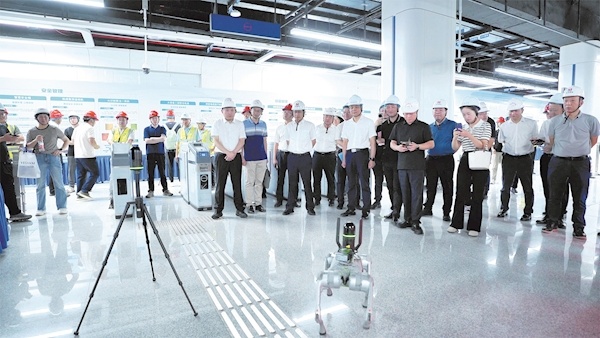与此同时,观摩会智能化展区内,集中展示智慧安全帽、热成像测温机、智能焊接机器人等各类智能施工设备。其中,最引人关注的是搭载了激光雷达与高精度传感器的智能巡检机器狗,可远程操控或自动巡检,在轨道、站台边缘等区域灵活穿梭,实时回传高清视频并将数据上传至云端分析平台,助力项目打造智慧工地标杆。