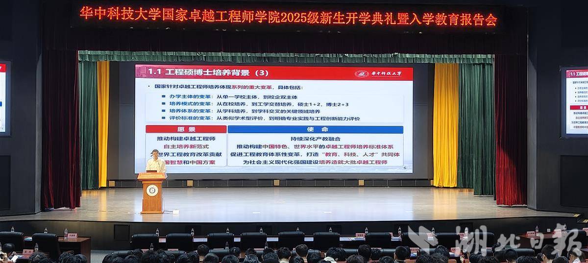 入学教育报告会上,华中科技大学国家卓越工程师学院副院长程强以《聚焦国家重大需求,强化产教深度融合,有组织成建制培养卓越工程师》为题,向新生宣讲该校国家卓越工程师学院培养体系。