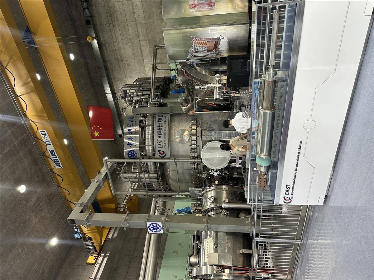 在合肥市蜀山区科学岛的一栋厂房内,记者见到了“人造太阳”:一个4层楼高、直径8米、重达400吨的大铁罐,现场技术人员们正在进行检修工作。
