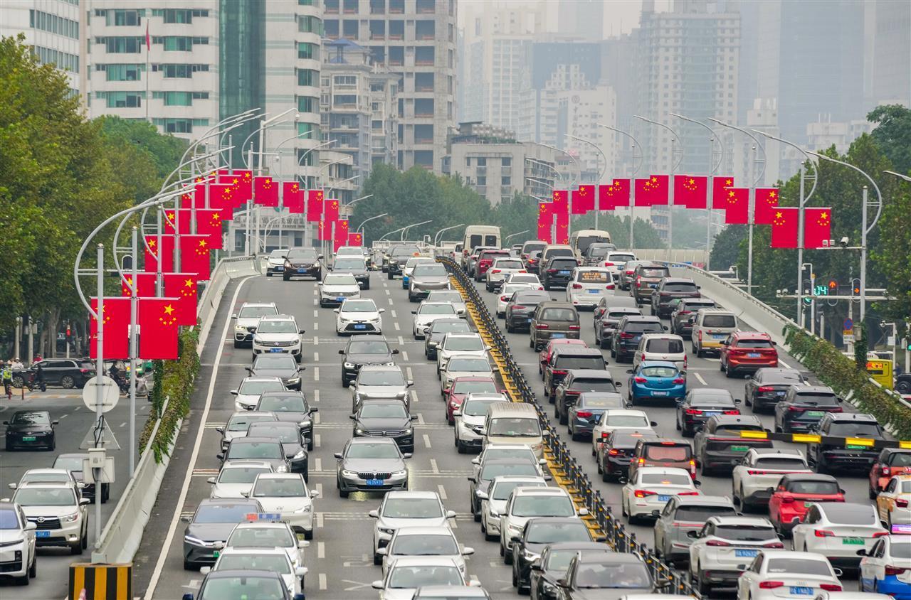 9月22日,在武汉解放大道及立交桥路灯上,挂上了一面面鲜艳的五星红旗,未来几天,街头陆续悬挂国旗,武汉将全线飘红。