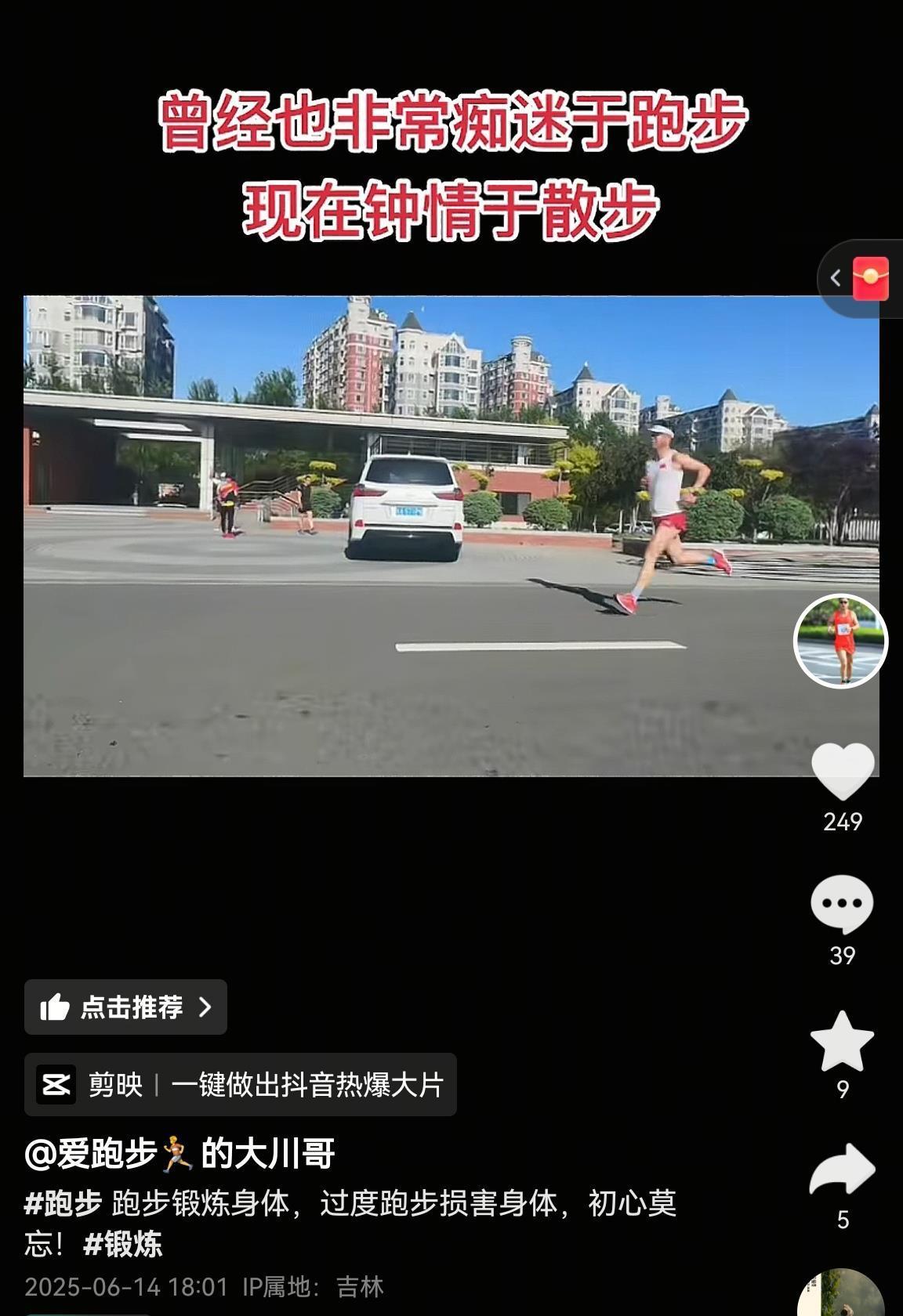 极目新闻记者注意到,今年6月14日,“大川哥”还曾发文称,自己曾经也非常痴迷于跑步,现在钟情于散步,跑步锻炼身体,过度跑步损害身体,初心莫忘!