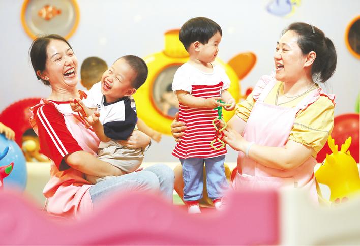 荆门市东宝区泉口街道浏河社区托育服务中心,通过“妈妈岗”计划实现就业的保育员正在和孩子进行趣味游戏。(视界网 赵平 欧阳萍 摄)