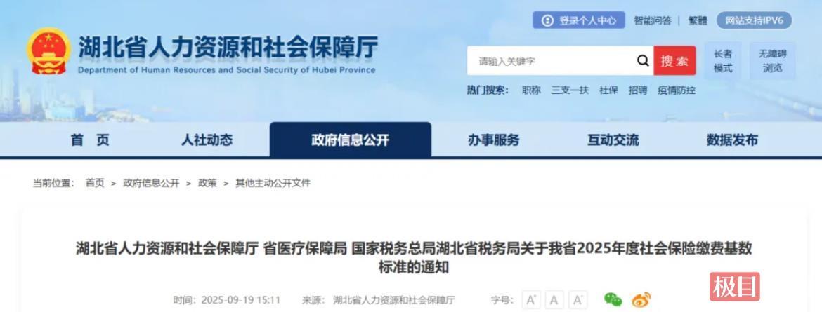 近日,湖北省人社厅官网发布《湖北省人力资源和社会保障厅 省医疗保障局 国家税务总局湖北省税务局关于我省2025年度社会保险缴费基数标准的通知》,以下为相关内容。