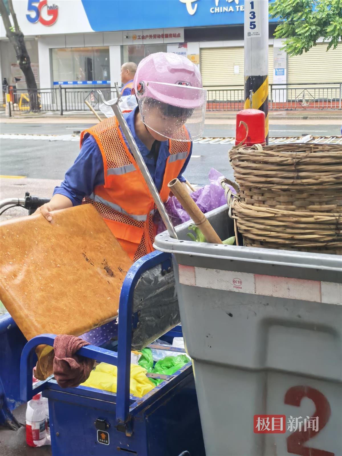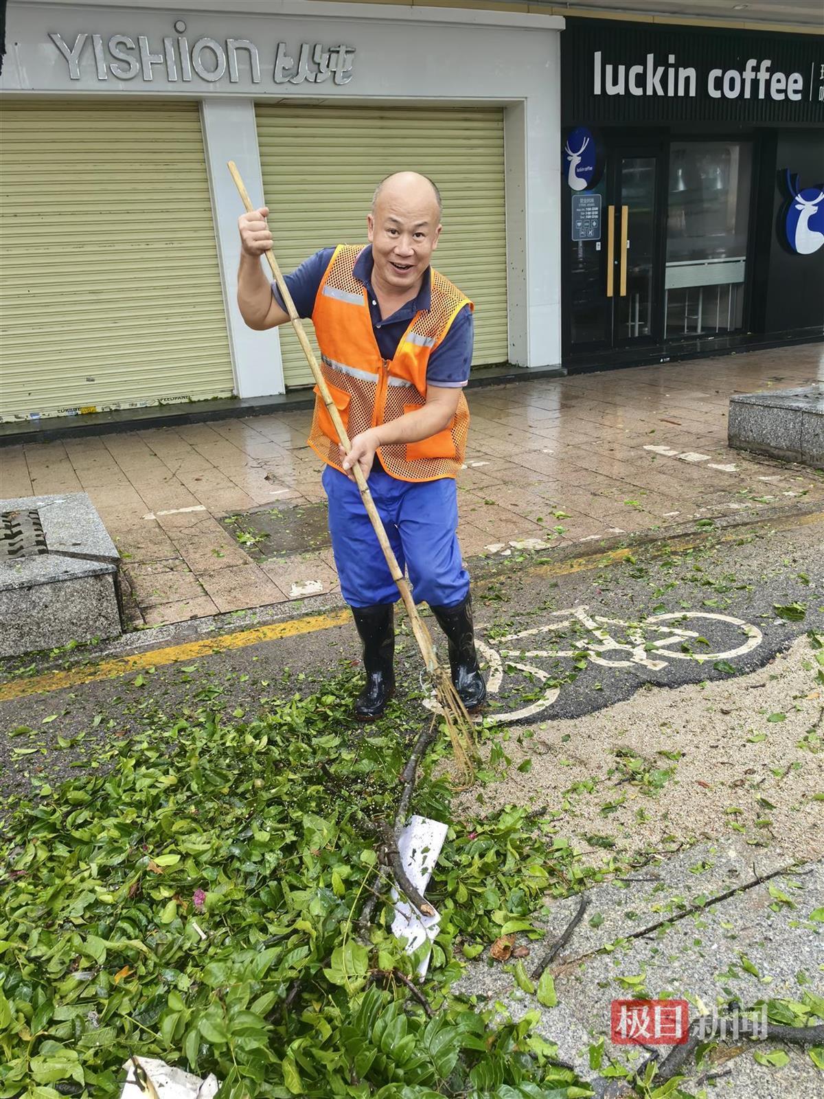 “我们是街道的环卫人员,3点左右风势减弱,我们就出来打扫了。”环卫工蔡师傅告诉极目新闻记者,打扫得快一点儿好方便行人走路。现场又下起了小雨,蔡师傅表示无碍,和其他工友继续打扫人行道。