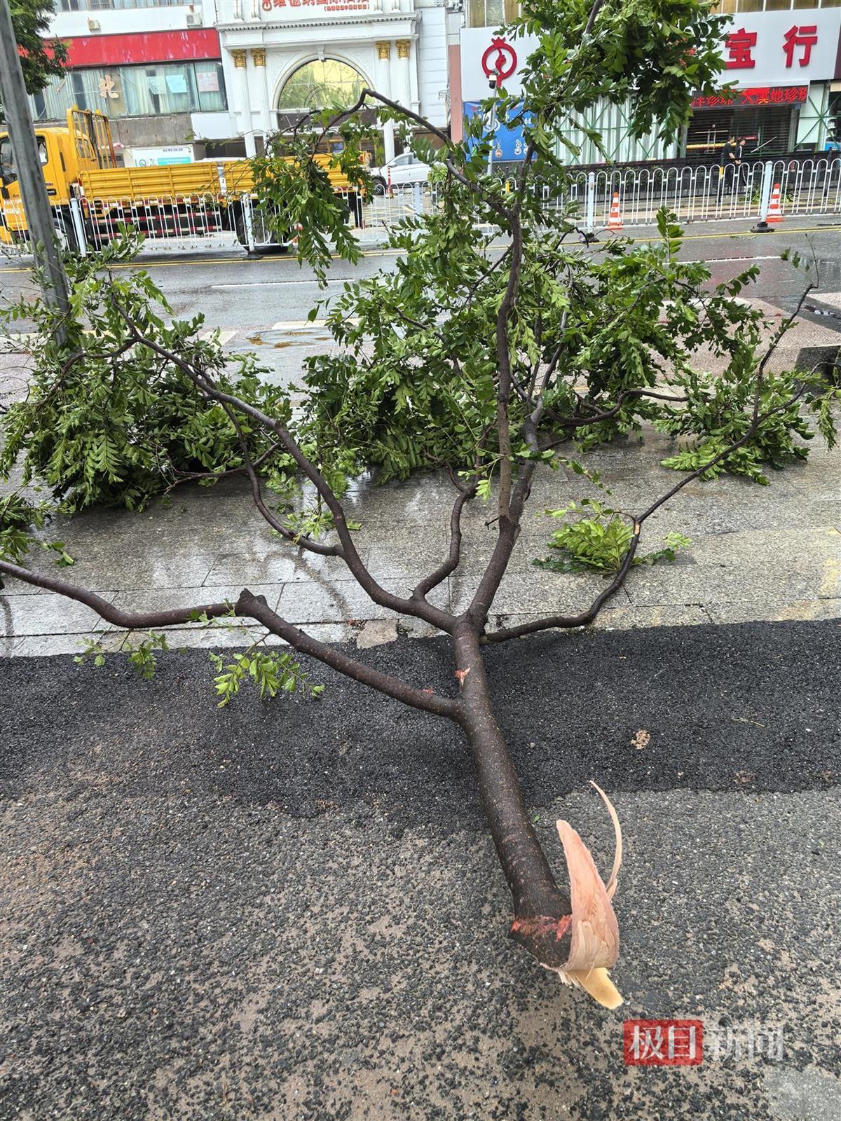 极目新闻记者在街头看到,到处散落着被台风吹掉的树叶和树枝等物,有不少树木被大风吹断,有共享单车倒在地上,有广告牌掉落在地。记者试图往情侣路外面的海边走,风力还是很大,步行有些困难。