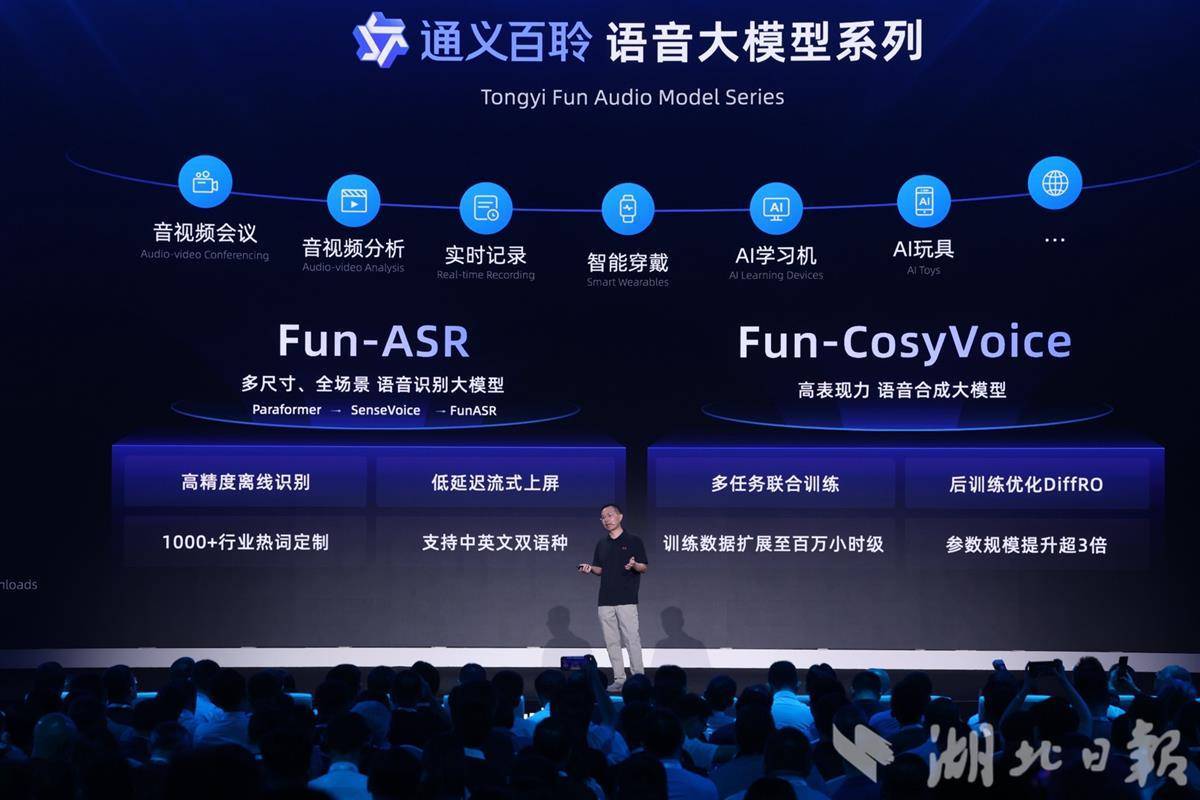 此次云栖大会上,通义大模型家族还迎来了全新的成员——语音大模型通义百聆。百聆发布了语音识别大模型Fun-ASR和语音合成大模型Fun-CosyVoice。Fun-ASR具备强大的上下文理解能力与行业适应性;Fun-CosyVoice可提供上百种预制音色,可以用于客服、销售、直播电商、消费电子、有声书、儿童娱乐等场景。