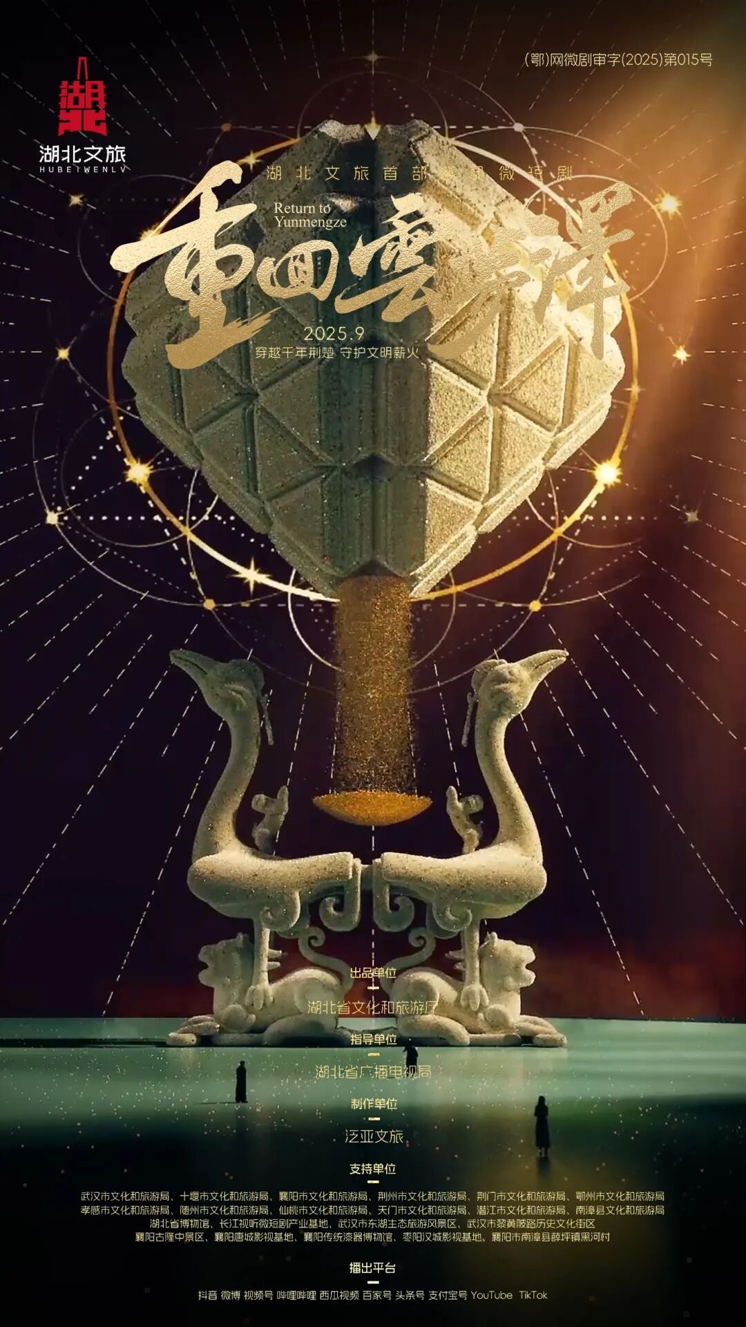 《重回云梦泽》经国家广电总局备案、省广播电视局批准发行,将在湖北日报客户端、抖音、视频号、微博、B站、西瓜视频、百家号、头条号、支付宝号,海外YOUTUBE、TIKTOK等平台同步播出。