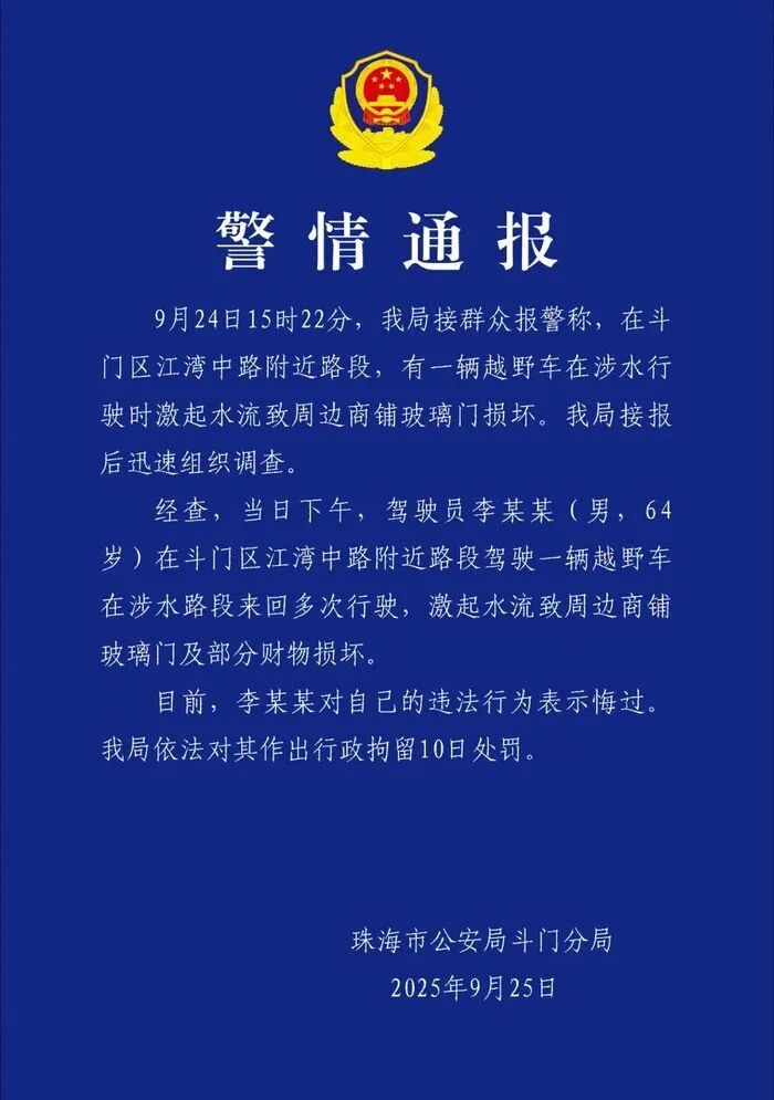 珠海市公安局斗门分局9月25日通报,9月24日15时22分,该局接群众报警称,在斗门区江湾中路附近路段,有一辆越野车在涉水行驶时激起水流致周边商铺玻璃门损坏。警方接报后迅速组织调查。