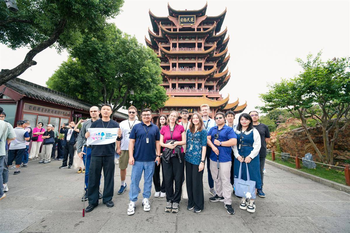 国际青年代表在武汉黄鹤楼前合影留念。(荆州市委宣传部供图)