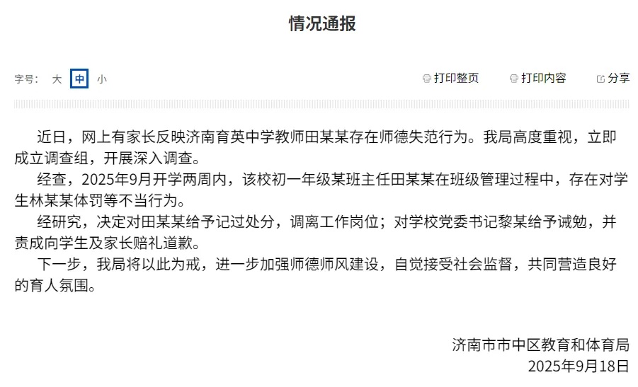 9月18日,济南市市中区教体局发布《情况通报》称,近日,网上有家长反映济南育英中学教师田某某存在师德失范行为。经查,2025年9月开学两周内,该校初一年级某班主任田某某在班级管理过程中,存在对学生林某某体罚等不当行为。经研究,决定对田某某给予记过处分,调离工作岗位;对学校党委书记黎某给予诫勉,并责成向学生及家长赔礼道歉。