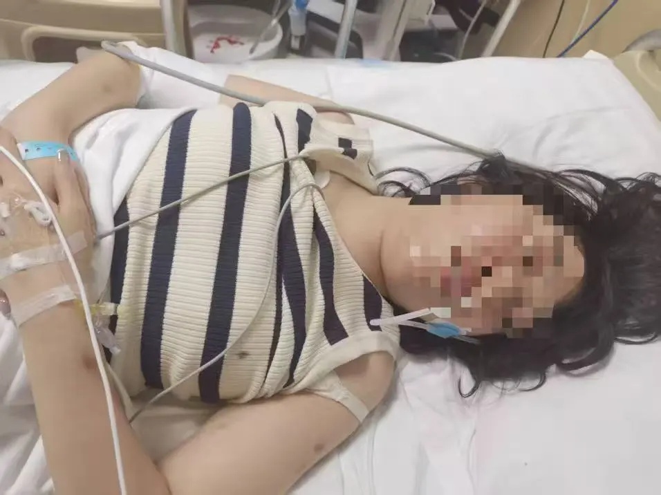 病床上,付女士蜷缩侧躺在病床,身上插着管。她虚弱地说,“他们还是不给我看监控,监控调不出来。”