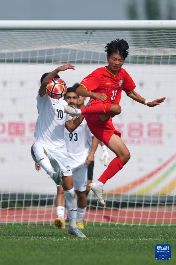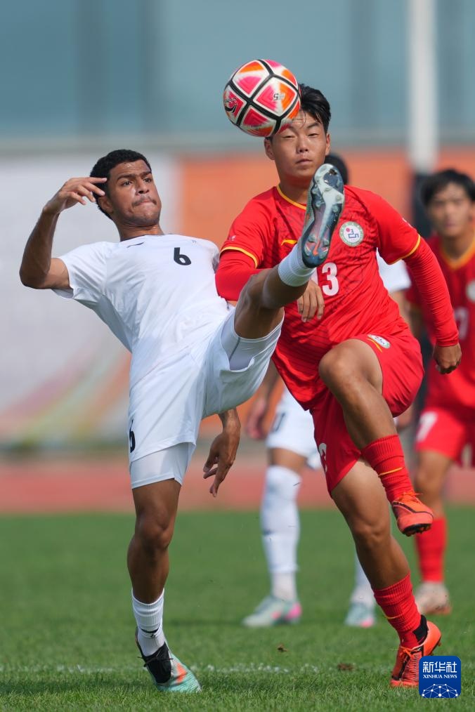 9月26日,延边大学队球员周锦渝(右)和沙迦大学队球员穆萨卜·易卜拉欣·卡拉姆·阿里在比赛中拼抢。